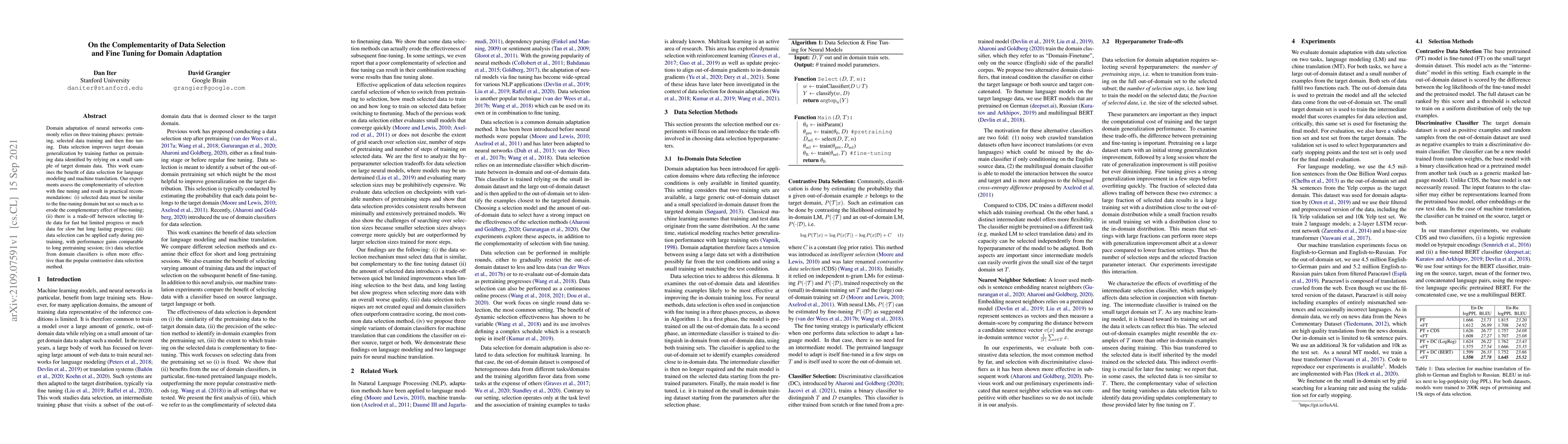 Domain adaptation of neural networks commonly relies on three training phases: pretraining, selected data training and then fine tuning. Data selection improves target domain generalization by training further on pretraining data identified by relying on a small sample of target domain data. This work examines the benefit of data selection for language modeling and machine translation. Our experiments assess the complementarity of selection with fine tuning and result in practical recommendations: (i) selected data must be similar to the fine-tuning domain but not so much as to erode the complementary effect of fine-tuning; (ii) there is a trade-off between selecting little data for fast but limited progress or much data for slow but long lasting progress; (iii) data selection can be applied early during pretraining, with performance gains comparable to long pretraining session; (iv) data selection from domain classifiers is often more effective than the popular contrastive data selection method.