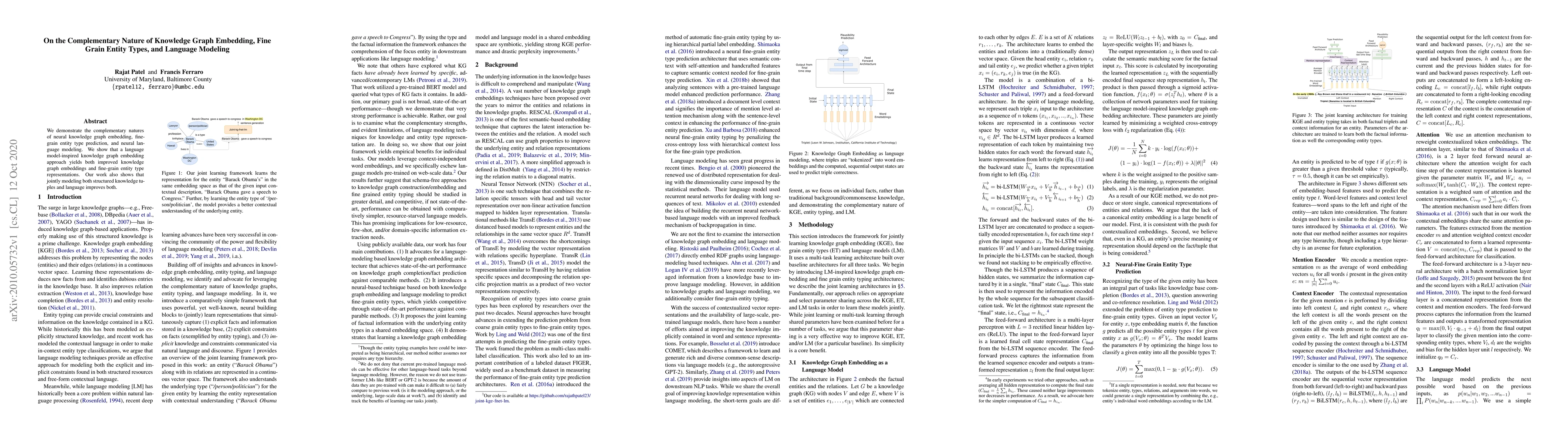 We demonstrate the complementary natures of neural knowledge graph embedding, fine-grain entity type prediction, and neural language modeling. We show that a language model-inspired knowledge graph embedding approach yields both improved knowledge graph embeddings and fine-grain entity type representations. Our work also shows that jointly modeling both structured knowledge tuples and language improves both.