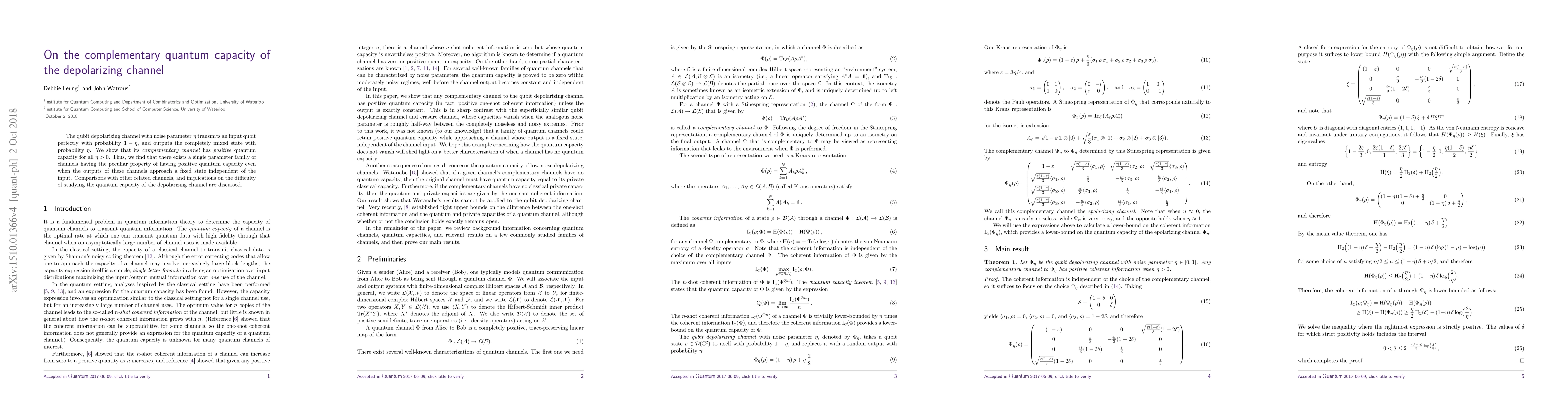 The paper demonstrates that the complementary channel of the qubit depolarizing channel has positive quantum capacity for all noise parameters greater than zero. This finding reveals a unique property among channels where outputs tend toward a fixed state, independent of input, yet still maintain quantum capacity.
