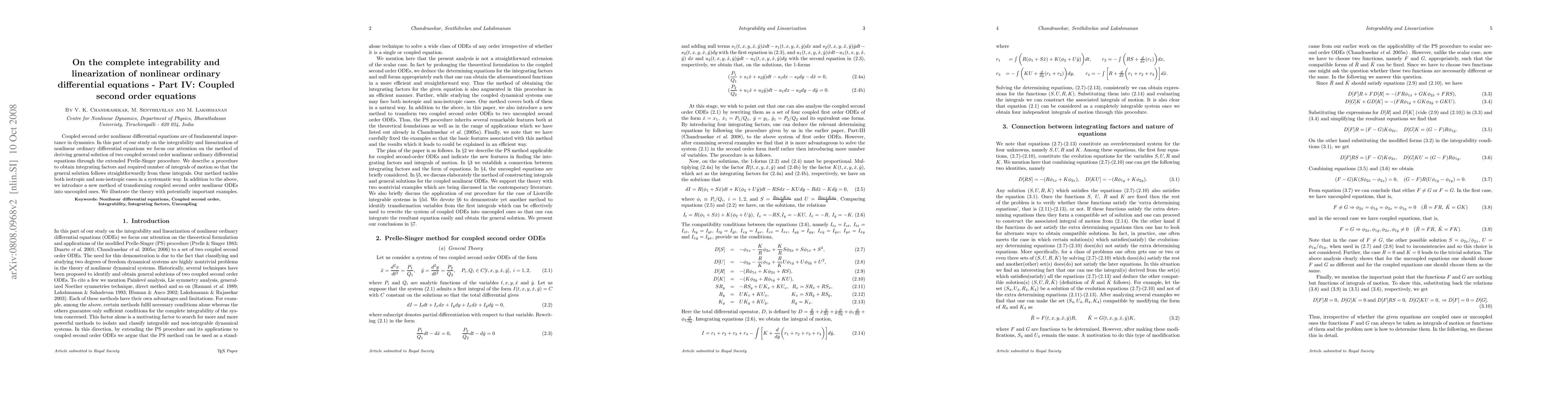 This paper develops a systematic method to derive general solutions for coupled second order nonlinear ordinary differential equations using the extended Prelle-Singer procedure, including the identification of integrating factors and integrals of motion. It also introduces a new transformation technique to convert these coupled equations into uncoupled forms, illustrated through significant examples.