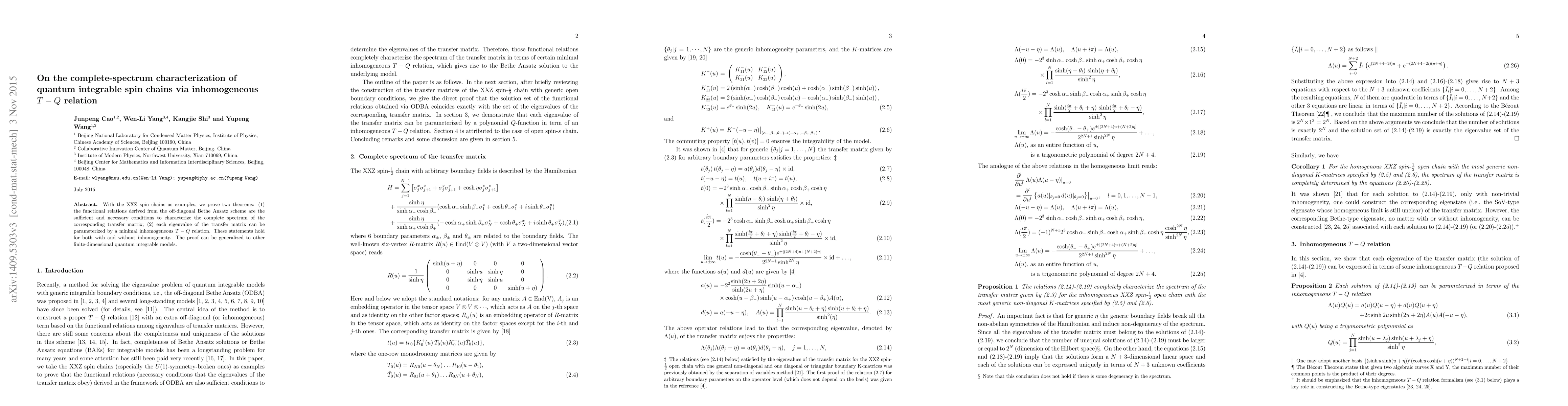 With the XXZ spin chains as examples, we prove two theorems: (1) the functional relations derived from the off-diagonal Bethe Ansatz scheme are the sufficient and necessary conditions to characterize the complete spectrum of the corresponding transfer matrix; (2) each eigenvalue of the transfer matrix can be parameterized by a minimal inhomogeneous T-Q relation. These statements hold for both with and without inhomogeneity. The proof can be generalized to other finite-dimensional quantum integrable models.