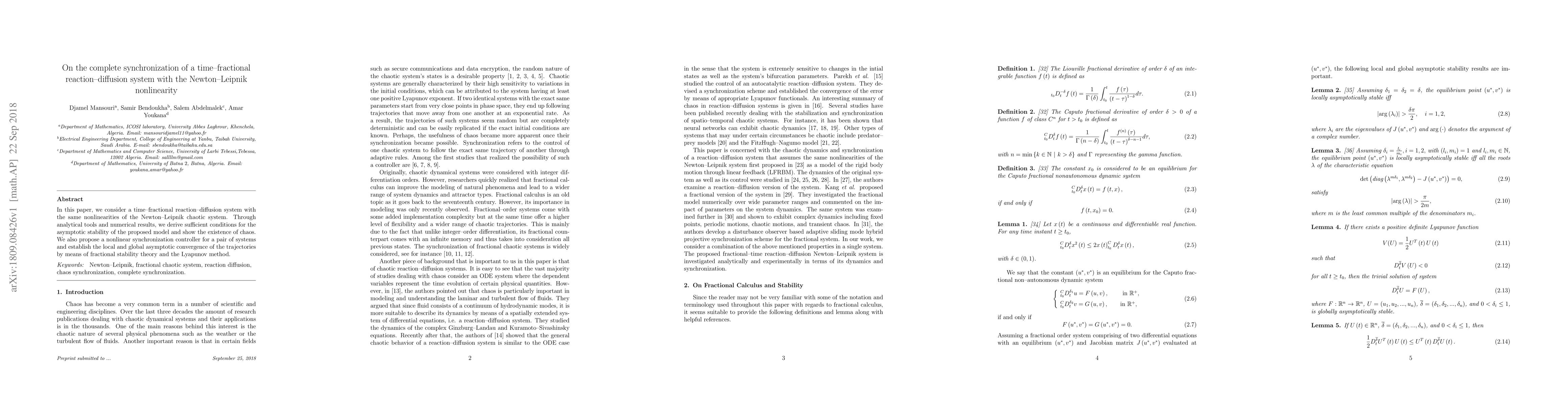 In this paper, we consider a time-fractional reaction-diffusion system with the same nonlinearities of the Newton-Leipnik chaotic system. Through analytical tools and numerical results, we derive sufficient conditions for the asymptotic stability of the proposed model and show the existence of chaos. We also propose a nonlinear synchronization controller for a pair of systems and establish the local and global asymptotic convergence of the trajectories by means of fractional stability theory and the Lyapunov method.