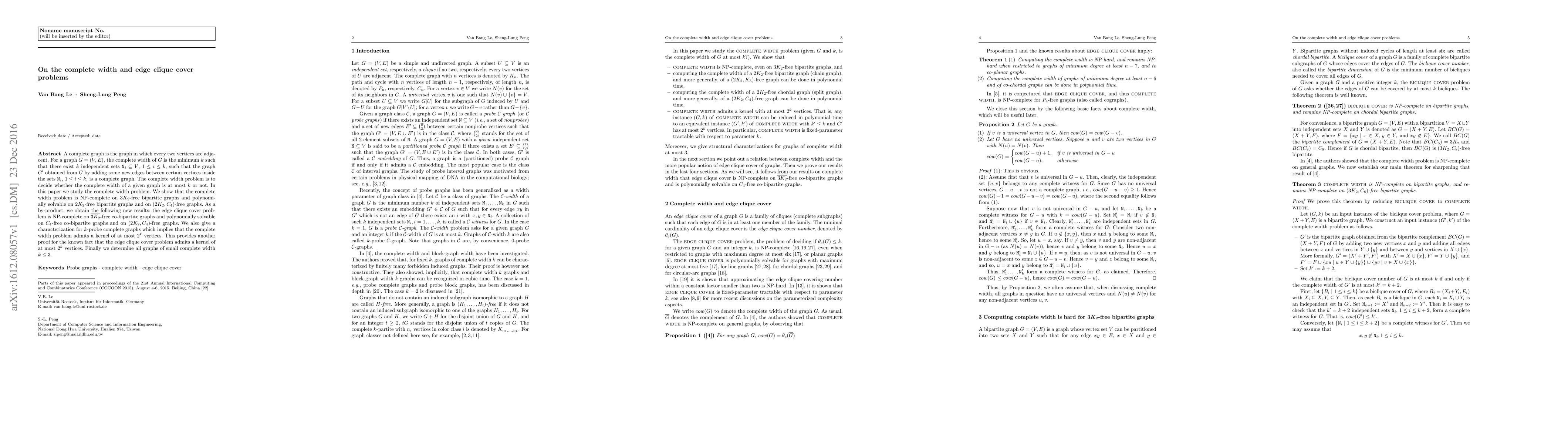 This paper investigates the complete width problem, which asks if a given graph can be transformed into a complete graph by adding a minimal number of edges within independent sets. The study reveals that the problem is NP-complete for $3K_2$-free bipartite graphs but polynomially solvable for $2K_2$-free bipartite and $(2K_2,C_4)$-free graphs. It also addresses the edge clique cover problem, finding it NP-complete for $\overline{3K_2}$-free co-bipartite graphs but polynomially solvable for $C_4$-free and $(2K_2, C_4)$-free co-bipartite graphs.