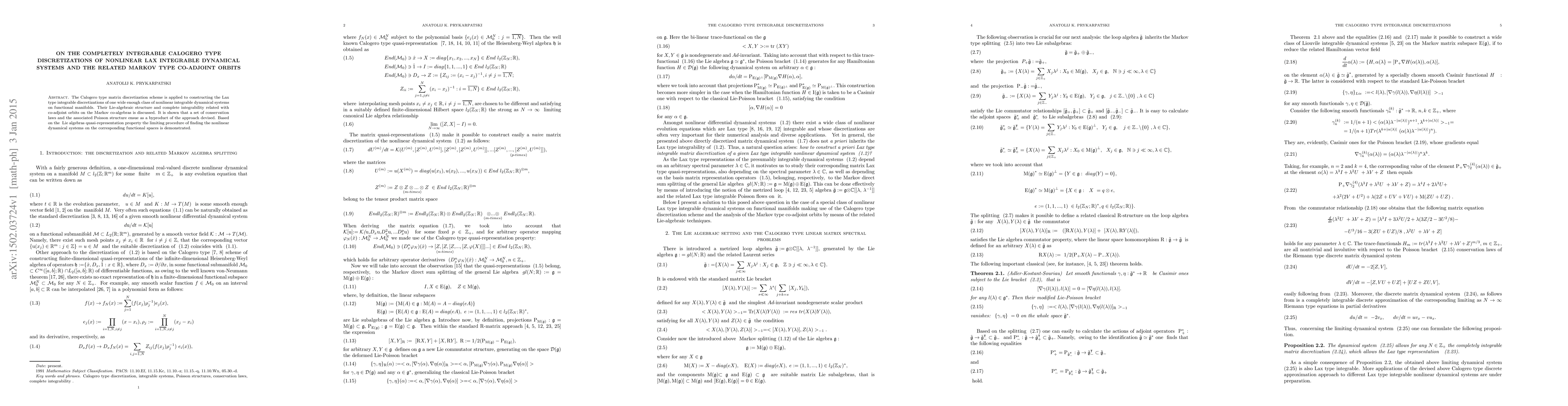 The Calogero type matrix discretization scheme is applied to constructing the Lax type integrable discretizations of one wide enough class of nonlinear integrable dynamical systems on functional manifolds. Their Lie-algebraic structure and complete integrability related with co-adjoint orbits on the Markov co-algebras is discussed. It is shown that a set of conservation laws and the associated Poisson structure ensue as a byproduct of the approach devised. Based on the Lie algebras quasi-representation property the limiting procedure of finding the nonlinear dynamical systems on the corresponding functional spaces is demonstrated.