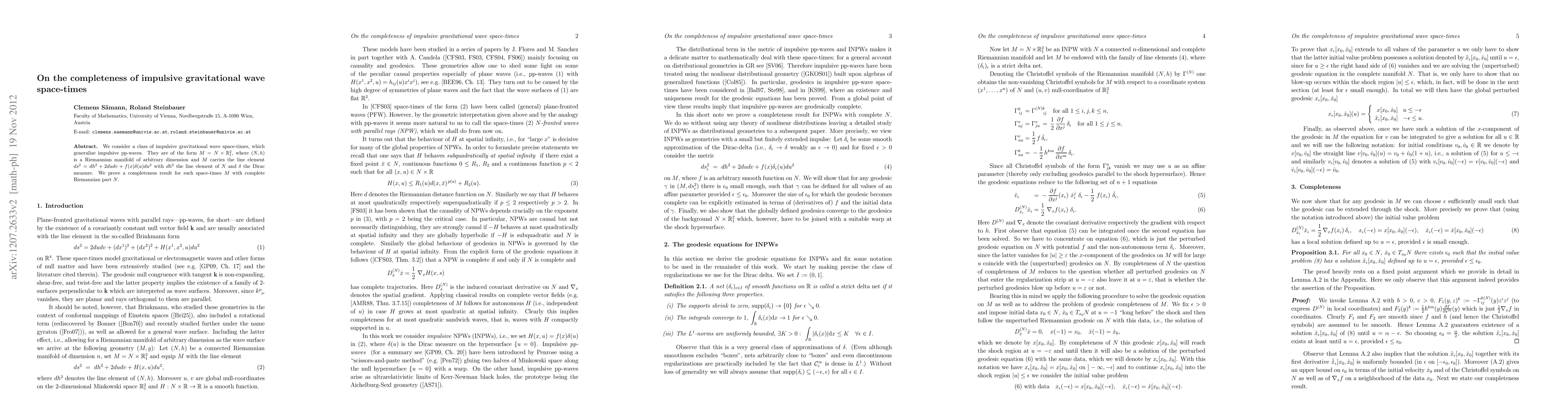 Researchers prove that impulsive gravitational wave space-times with a complete Riemannian part are complete, meaning they have no boundary points where the curvature becomes infinite.