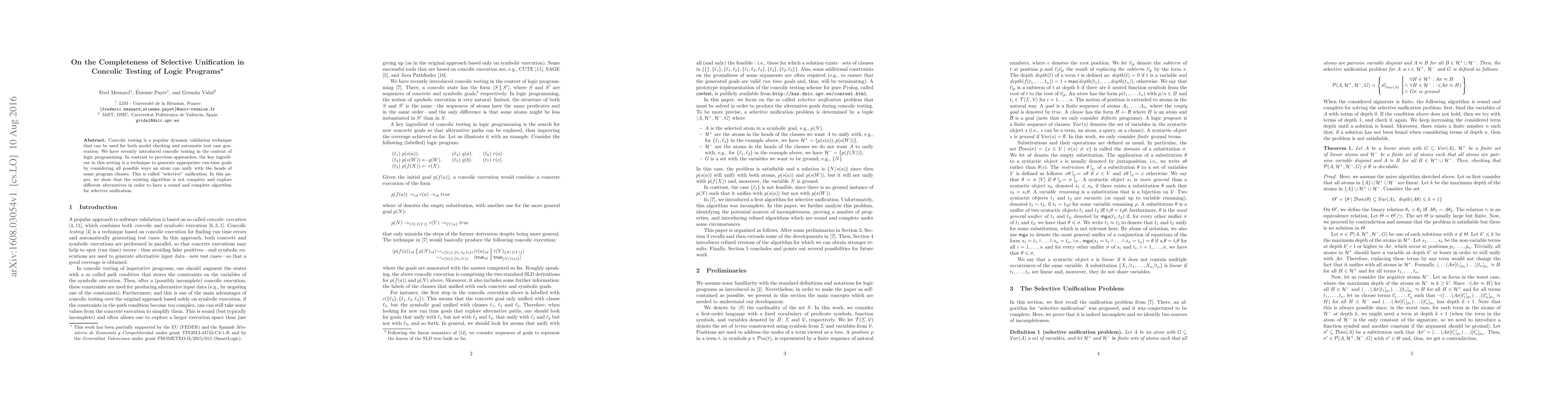 Researchers investigated concolic testing in logic programming, finding an existing algorithm for selective unification was incomplete. They explored alternatives to create a sound and complete algorithm for this technique.