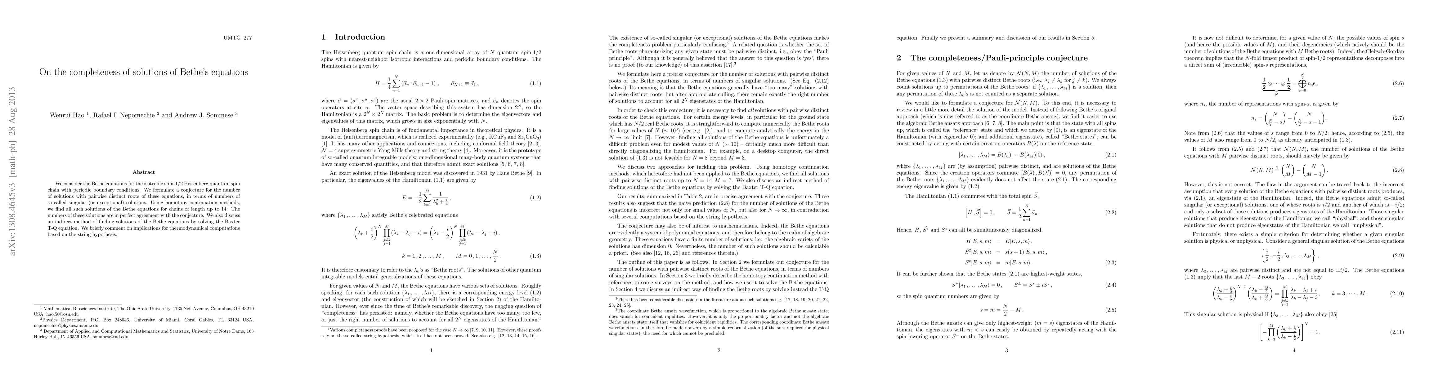 We consider the Bethe equations for the isotropic spin-1/2 Heisenberg quantum spin chain with periodic boundary conditions. We formulate a conjecture for the number of solutions with pairwise distinct roots of these equations, in terms of numbers of so-called singular (or exceptional) solutions. Using homotopy continuation methods, we find all such solutions of the Bethe equations for chains of length up to 14. The numbers of these solutions are in perfect agreement with the conjecture. We also discuss an indirect method of finding solutions of the Bethe equations by solving the Baxter T-Q equation. We briefly comment on implications for thermodynamical computations based on the string hypothesis.
