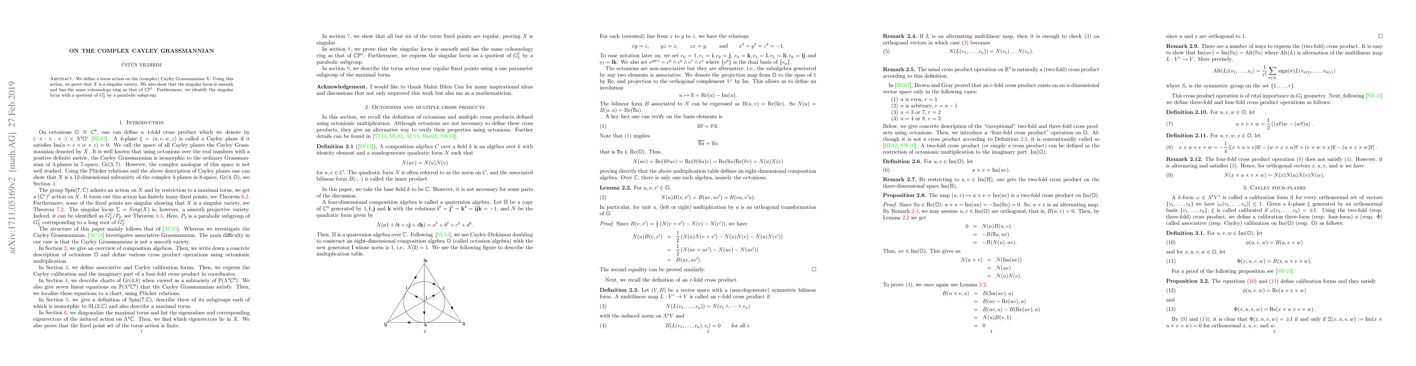 We define a torus action on the (complex) Cayley Grassmannian $X$. Using this action, we prove that $X$ is a singular variety. We also show that the singular locus is smooth and has the same cohomology ring as that of $\mathbb{CP}^5$. Furthermore, we identify the singular locus with a quotient of $G_2^\mathbb{C}$ by a parabolic subgroup.