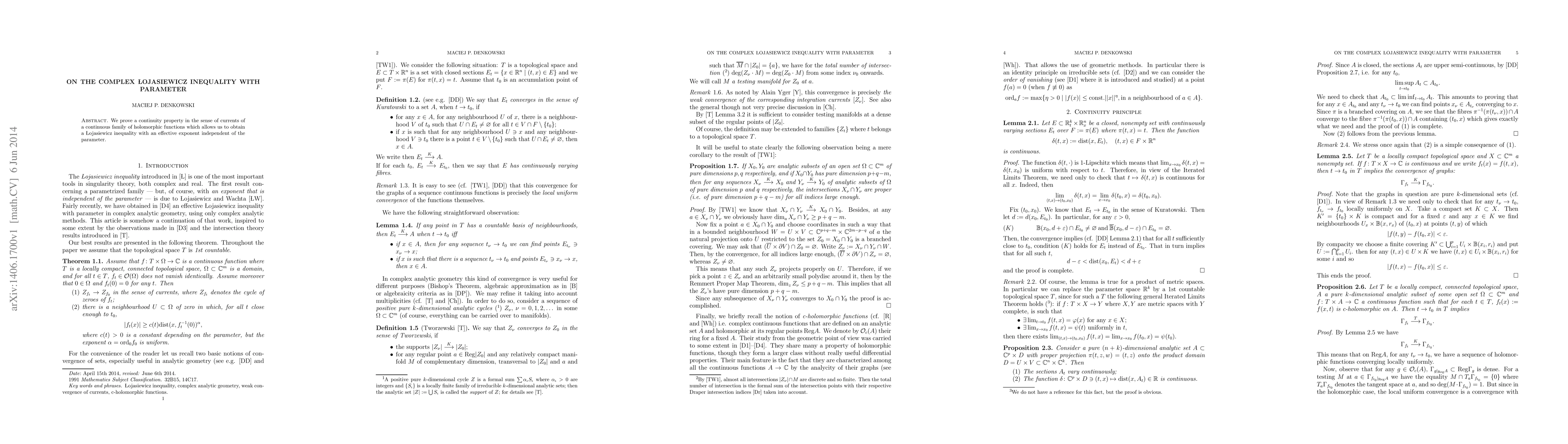 Researchers prove a continuity property for holomorphic functions that allows them to derive a Lojasiewicz inequality with an independent exponent, enabling effective use of the inequality in complex analysis.