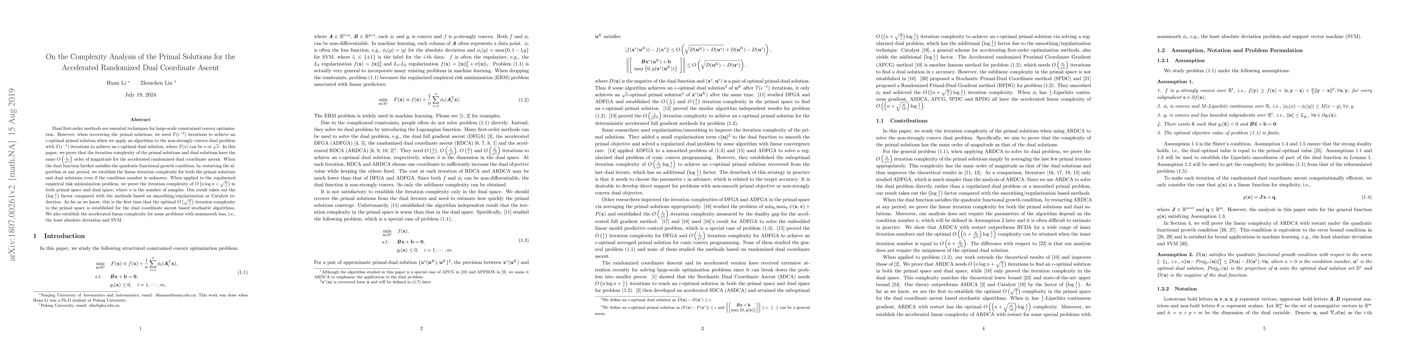 This paper analyzes the complexity of primal solutions for the accelerated randomized dual coordinate ascent method, showing that the iteration complexity for both primal and dual solutions is $O\left(\frac{1}{\sqrt{\epsilon}}\right)$. It also establishes linear iteration complexity under certain conditions and achieves optimal complexity for regularized empirical risk minimization.