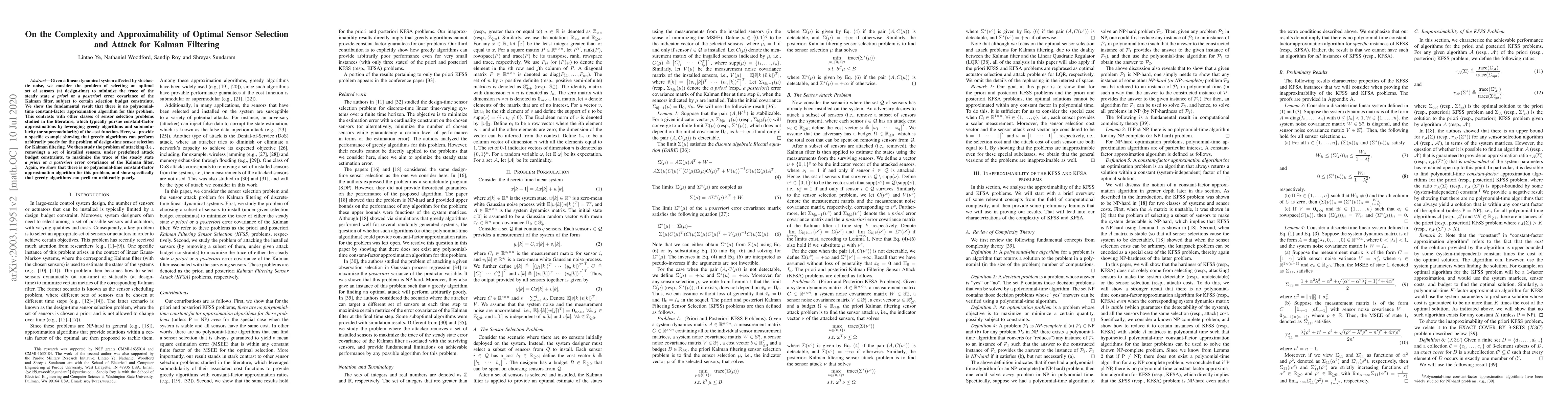 This paper investigates the complexity and approximability of optimal sensor selection and attack strategies for Kalman filtering. It demonstrates that neither problem has a polynomial-time constant-factor approximation algorithm, contrasting with typical greedy approaches used in other sensor selection problems.