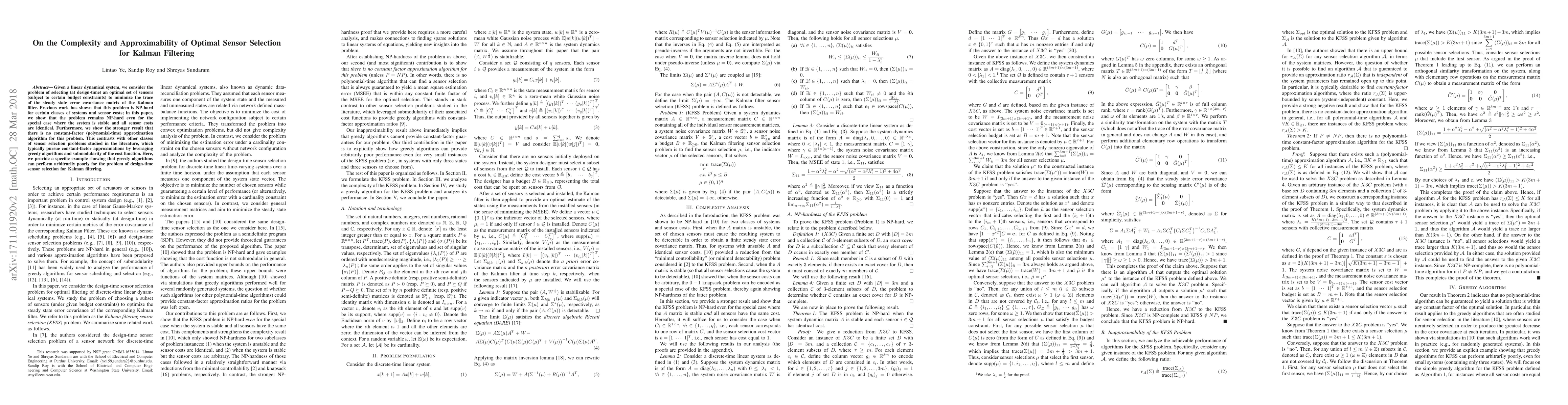 Given a linear dynamical system, we consider the problem of selecting (at design-time) an optimal set of sensors (subject to certain budget constraints) to minimize the trace of the steady state error covariance matrix of the Kalman filter. Previous work has shown that this problem is NP-hard for certain classes of systems and sensor costs; in this paper, we show that the problem remains NP-hard even for the special case where the system is stable and all sensor costs are identical. Furthermore, we show the stronger result that there is no constant-factor (polynomial-time) approximation algorithm for this problem. This contrasts with other classes of sensor selection problems studied in the literature, which typically pursue constant-factor approximations by leveraging greedy algorithms and submodularity of the cost function. Here, we provide a specific example showing that greedy algorithms can perform arbitrarily poorly for the problem of design-time sensor selection for Kalman filtering.