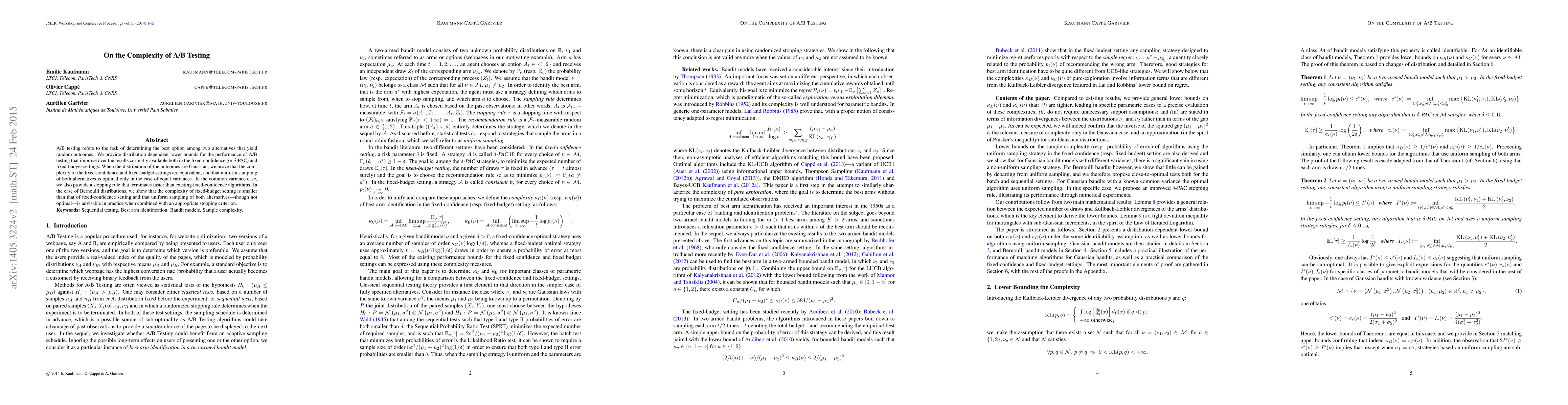 A/B testing refers to the task of determining the best option among two alternatives that yield random outcomes. We provide distribution-dependent lower bounds for the performance of A/B testing that improve over the results currently available both in the fixed-confidence (or delta-PAC) and fixed-budget settings. When the distribution of the outcomes are Gaussian, we prove that the complexity of the fixed-confidence and fixed-budget settings are equivalent, and that uniform sampling of both alternatives is optimal only in the case of equal variances. In the common variance case, we also provide a stopping rule that terminates faster than existing fixed-confidence algorithms. In the case of Bernoulli distributions, we show that the complexity of fixed-budget setting is smaller than that of fixed-confidence setting and that uniform sampling of both alternatives -though not optimal- is advisable in practice when combined with an appropriate stopping criterion.
