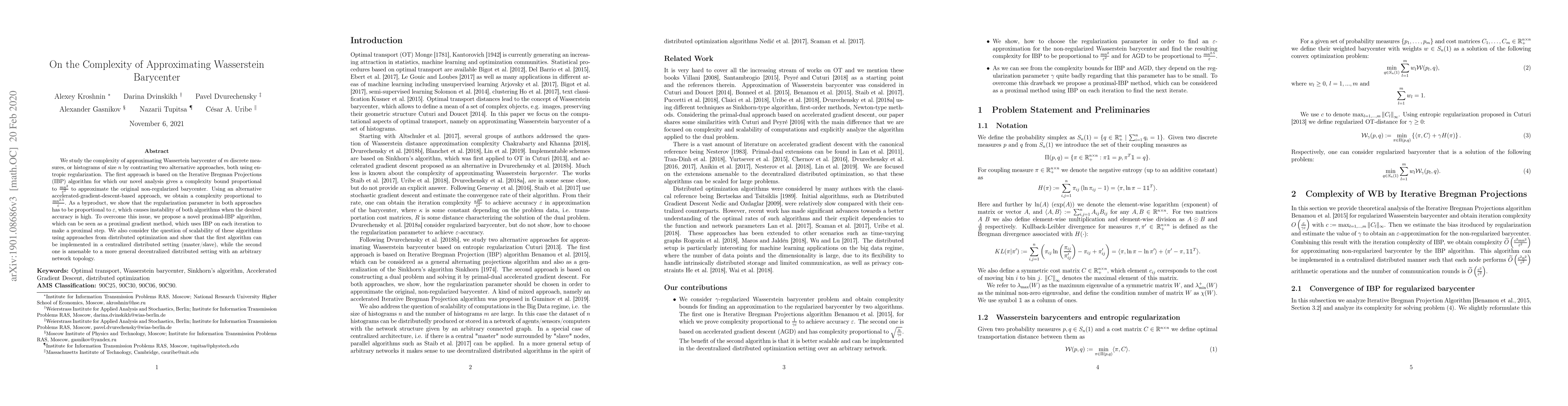 Researchers analyzed the complexity of approximating Wasserstein barycenter using two approaches with entropic regularization, finding that one approach has a complex computational cost proportional to $mn^2/ ext{Å}^2$, while another is more scalable but unstable for high accuracy.