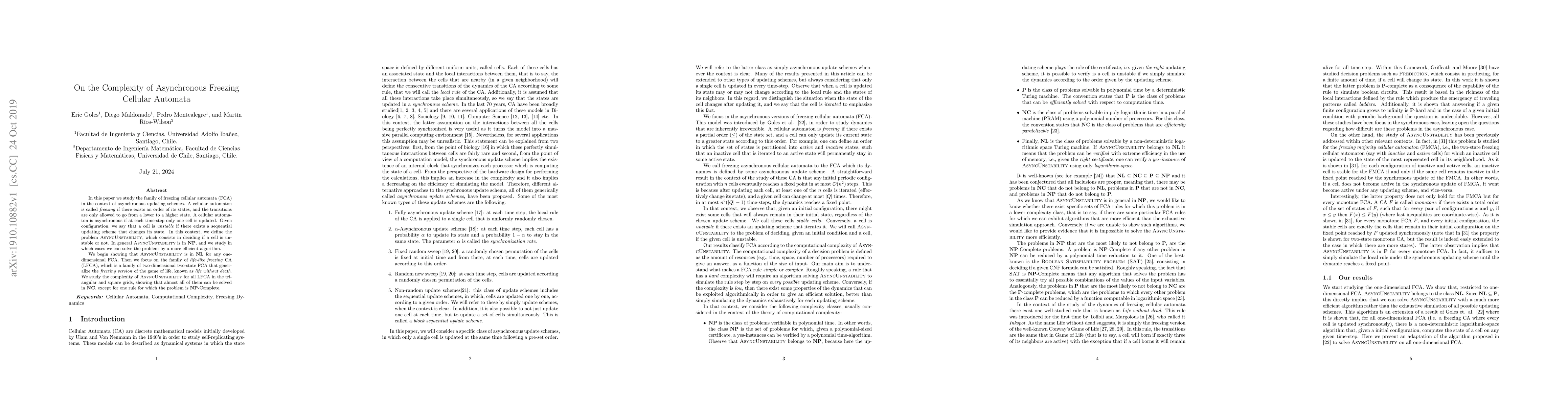This paper explores the complexity of asynchronous freezing cellular automata (FCA), focusing on the problem AsyncUnstability, which determines if a cell is unstable under asynchronous updates. It shows that AsyncUnstability is in NL for one-dimensional FCA and in NC for most two-dimensional life-like freezing CA, except for one rule where it becomes NP-complete.