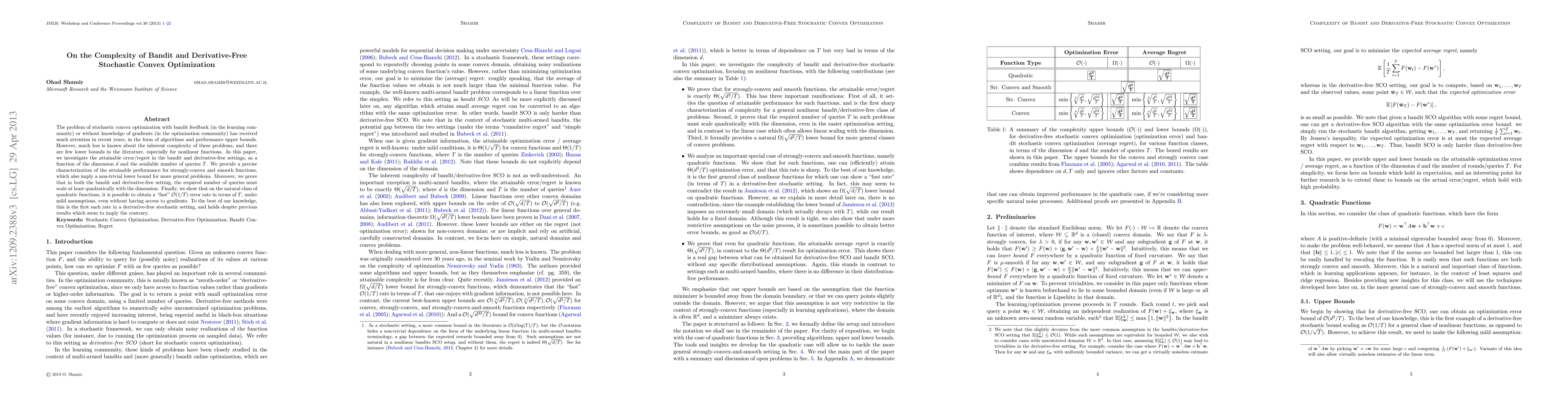 This paper investigates the complexity of stochastic convex optimization with bandit feedback, providing precise performance characterizations for strongly-convex and smooth functions. It establishes that the required number of queries scales quadratically with dimension and demonstrates a "fast" O(1/T) error rate for quadratic functions without gradient access.