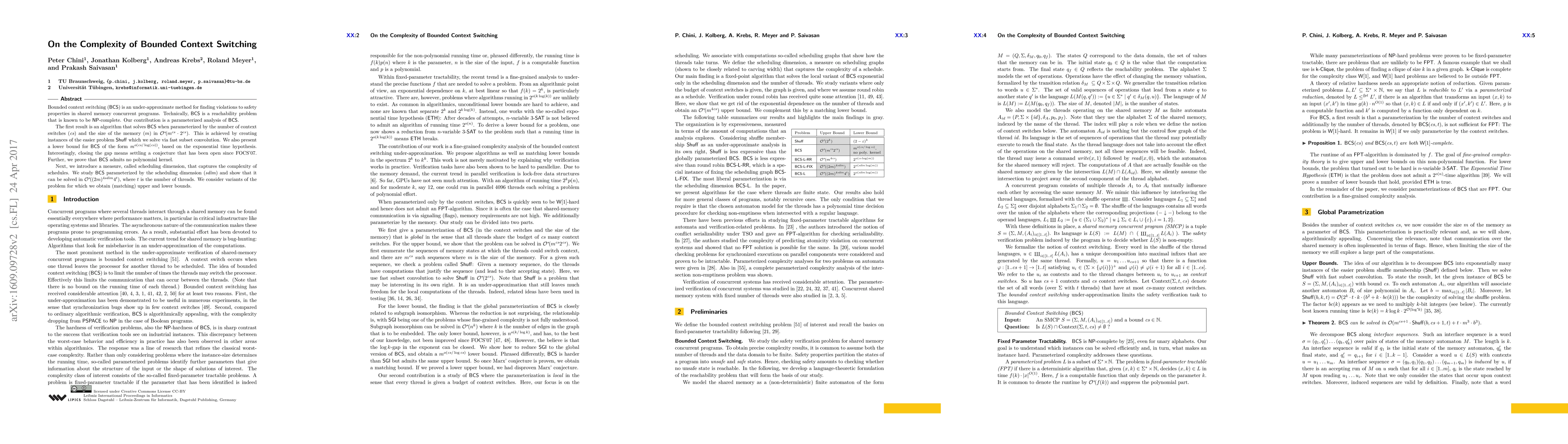 Bounded context switching (BCS) is an under-approximate method for finding violations to safety properties in shared memory concurrent programs. Technically, BCS is a reachability problem that is known to be NP-complete. Our contribution is a parameterized analysis of BCS. The first result is an algorithm that solves BCS when parameterized by the number of context switches (cs) and the size of the memory (m) in O*(m^(cs)2^(cs)). This is achieved by creating instances of the easier problem Shuff which we solve via fast subset convolution. We also present a lower bound for BCS of the form m^o(cs / log(cs)), based on the exponential time hypothesis. Interestingly, closing the gap means settling a conjecture that has been open since FOCS'07. Further, we prove that BCS admits no polynomial kernel. Next, we introduce a measure, called scheduling dimension, that captures the complexity of schedules. We study BCS parameterized by the scheduling dimension (sdim) and show that it can be solved in O*((2m)^(4sdim)4^t)$, where t is the number of threads. We consider variants of the problem for which we obtain (matching) upper and lower bounds.