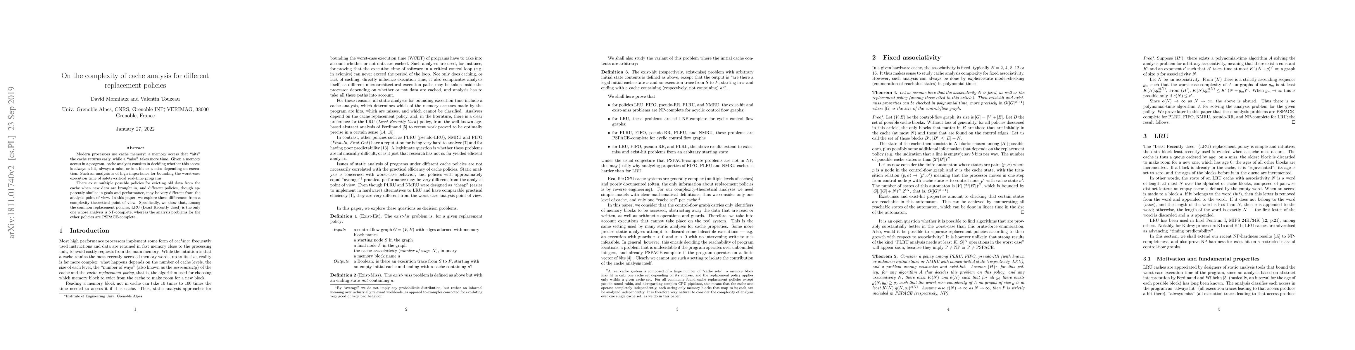 This paper investigates the complexity of cache analysis under various replacement policies, demonstrating that LRU analysis is NP-complete, while other policies like FIFO and LFU have PSPACE-complete analysis problems.