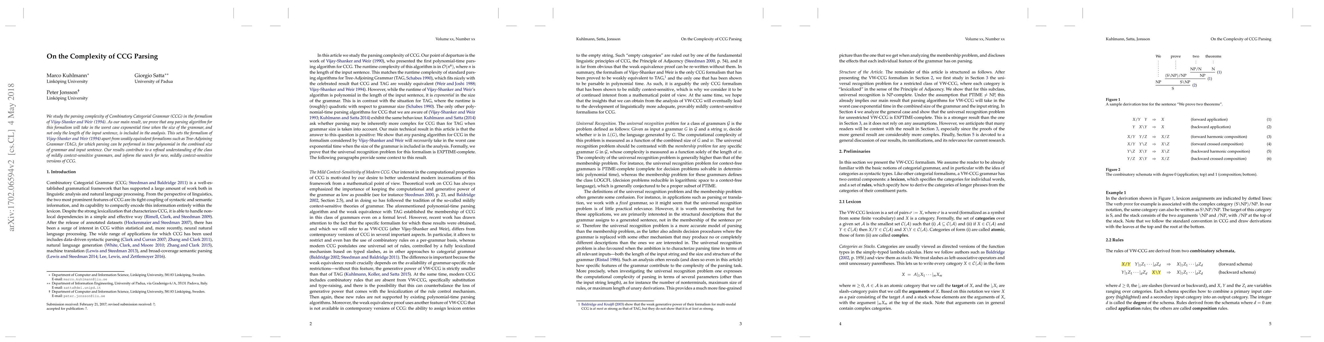 We study the parsing complexity of Combinatory Categorial Grammar (CCG) in the formalism of Vijay-Shanker and Weir (1994). As our main result, we prove that any parsing algorithm for this formalism will take in the worst case exponential time when the size of the grammar, and not only the length of the input sentence, is included in the analysis. This sets the formalism of Vijay-Shanker and Weir (1994) apart from weakly equivalent formalisms such as Tree-Adjoining Grammar (TAG), for which parsing can be performed in time polynomial in the combined size of grammar and input sentence. Our results contribute to a refined understanding of the class of mildly context-sensitive grammars, and inform the search for new, mildly context-sensitive versions of CCG.