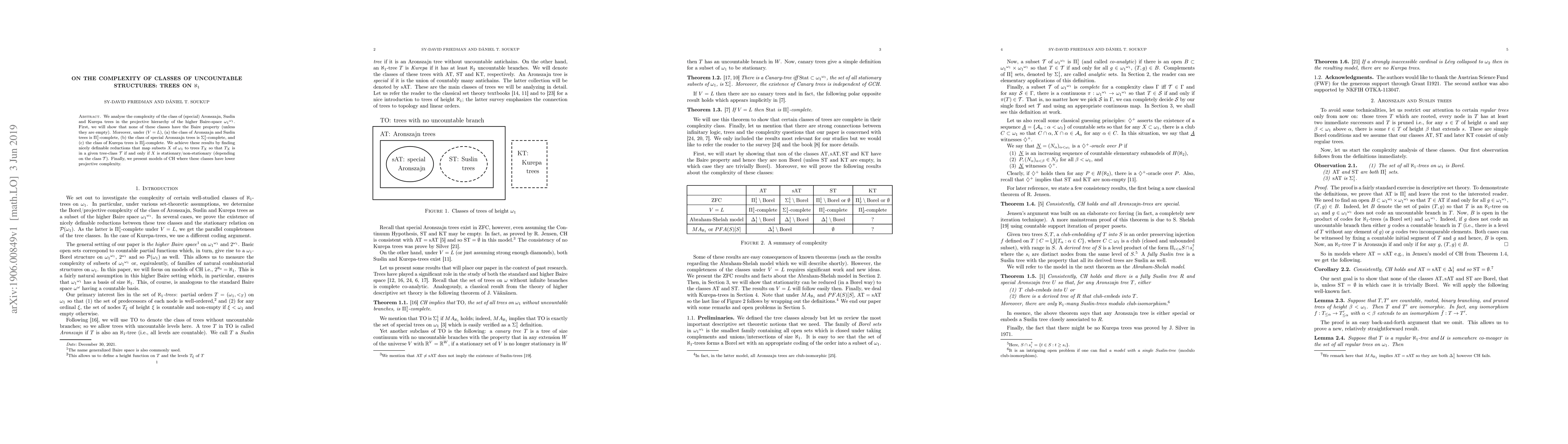 We analyse the complexity of the class of (special) Aronszajn, Suslin and Kurepa trees in the projective hierarchy of the higher Baire-space $\omega_1^{\omega_1}$. First, we will show that none of these classes have the Baire property (unless they are empty). Moreover, under $(V=L)$, (a) the class of Aronszajn and Suslin trees is $\Pi_1^1$-complete, (b) the class of special Aronszajn trees is $\Sigma_1^1$-complete, and (c) the class of Kurepa trees is $\Pi^1_2$-complete. We achieve these results by finding nicely definable reductions that map subsets $X$ of $\omega_1$ to trees $T_X$ so that $T_X$ is in a given tree-class $\mathcal T$ if and only if $X$ is stationary/non-stationary (depending on the class $\mathcal T$). Finally, we present models of CH where these classes have lower projective complexity.