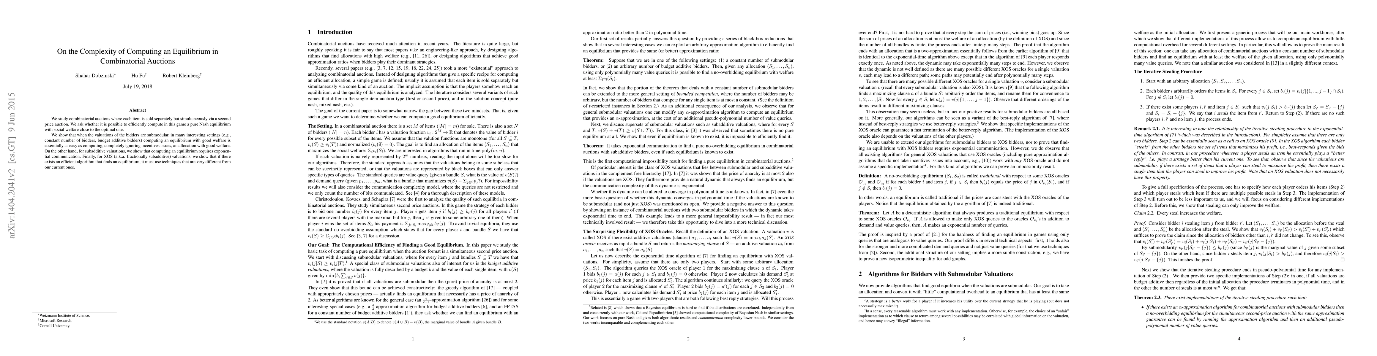 A recent study explores the complexity of computing an equilibrium in combinatorial auctions with different types of valuations, finding that efficient computation is possible for submodular valuations but requires exponential communication for subadditive valuations.