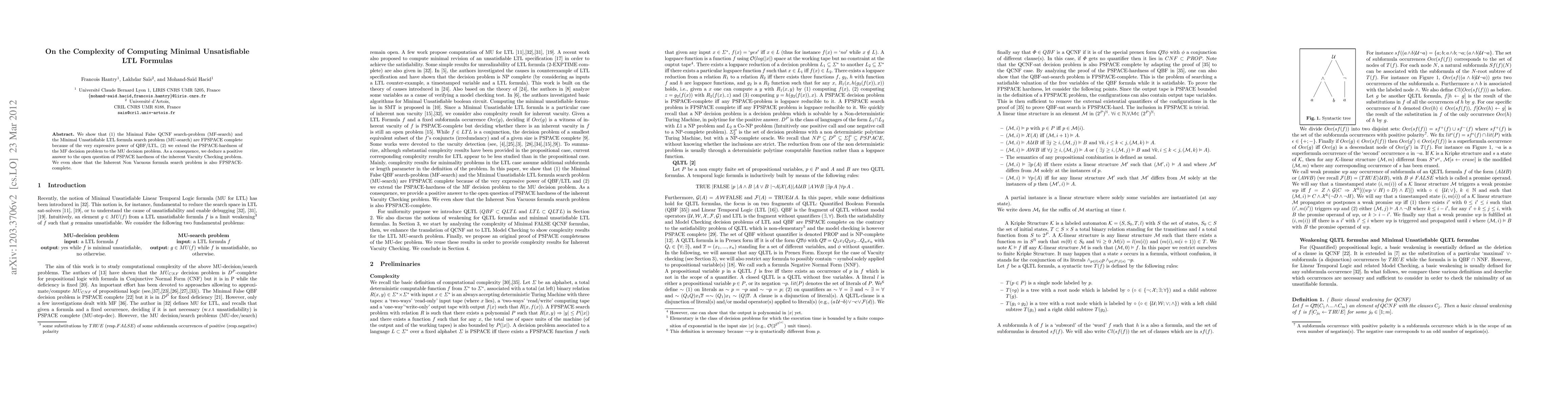We show that (1) the Minimal False QCNF search-problem (MF-search) and the Minimal Unsatisfiable LTL formula search problem (MU-search) are FPSPACE complete because of the very expressive power of QBF/LTL, (2) we extend the PSPACE-hardness of the MF decision problem to the MU decision problem. As a consequence, we deduce a positive answer to the open question of PSPACE hardness of the inherent Vacuity Checking problem. We even show that the Inherent Non Vacuous formula search problem is also FPSPACE-complete.