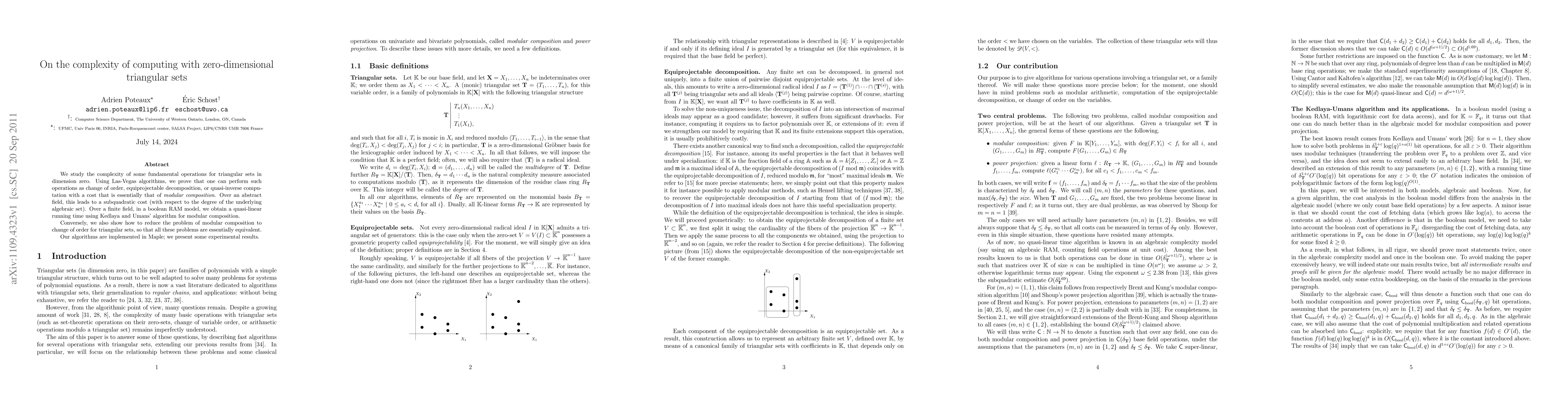 Researchers develop efficient algorithms for basic operations on triangular sets in dimension zero, achieving subquadratic cost over an abstract field and quasi-linear time over finite fields.