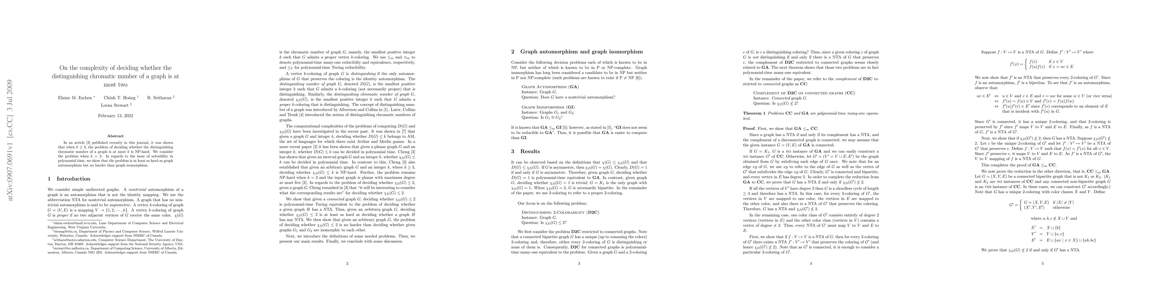 Researchers show that deciding if a graph's distinguishing chromatic number is at most 2 is as hard as graph automorphism but no harder than graph isomorphism.