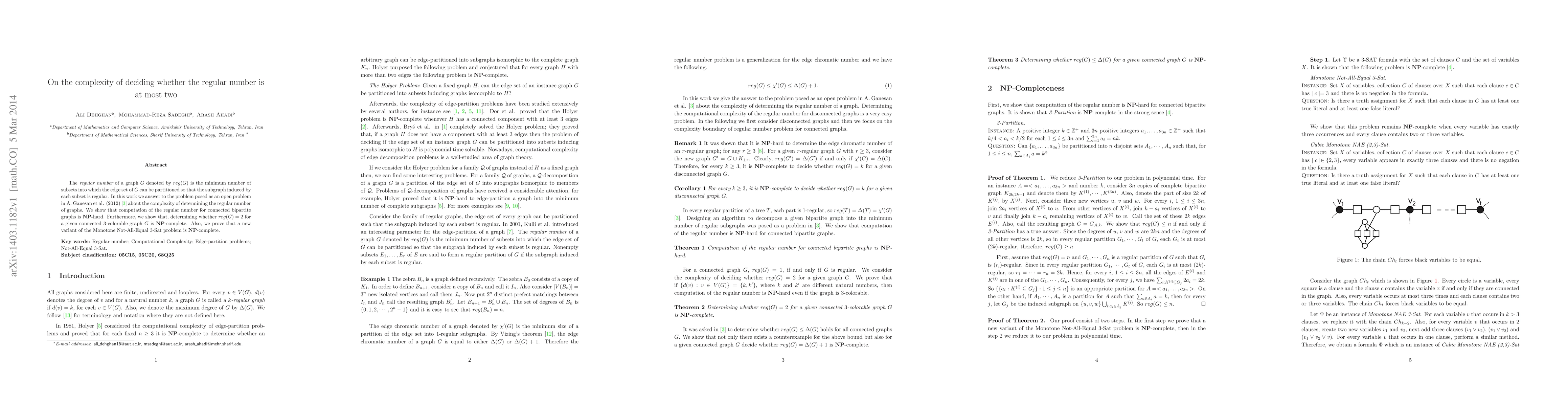 The regular number of a graph G denoted by reg(G) is the minimum number of subsets into which the edge set of G can be partitioned so that the subgraph induced by each subset is regular. In this work we answer to the problem posed as an open problem in A. Ganesan et al. (2012) [3] about the complexity of determining the regular number of graphs. We show that computation of the regular number for connected bipartite graphs is NP-hard. Furthermore, we show that, determining whether reg(G) = 2 for a given connected 3-colorable graph G is NP-complete. Also, we prove that a new variant of the Monotone Not-All-Equal 3-Sat problem is NP-complete.