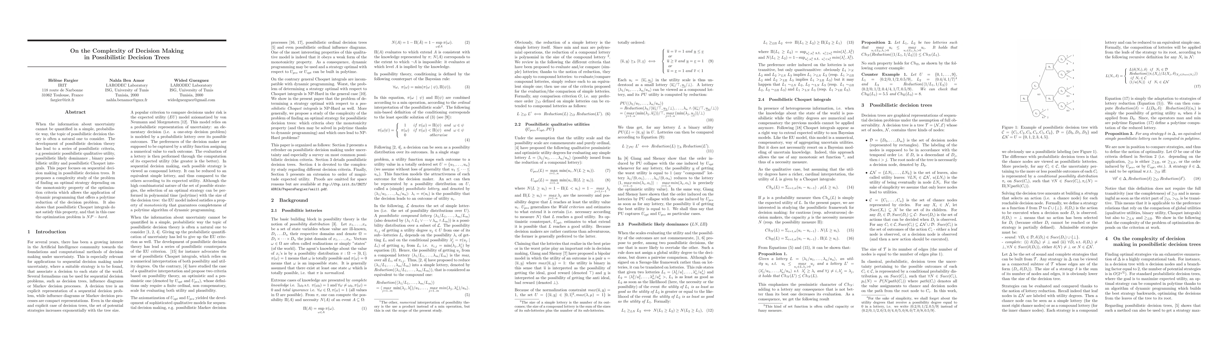 This paper investigates the complexity of decision making in possibilistic decision trees when uncertainty is not quantifiable in a probabilistic manner. It proposes a complexity study of finding optimal strategies based on the monotonicity of optimization criteria, demonstrating that dynamic programming can reduce the problem to polynomial time, but not when using possibilistic Choquet integrals, which leads to NP-hard optimization problems.