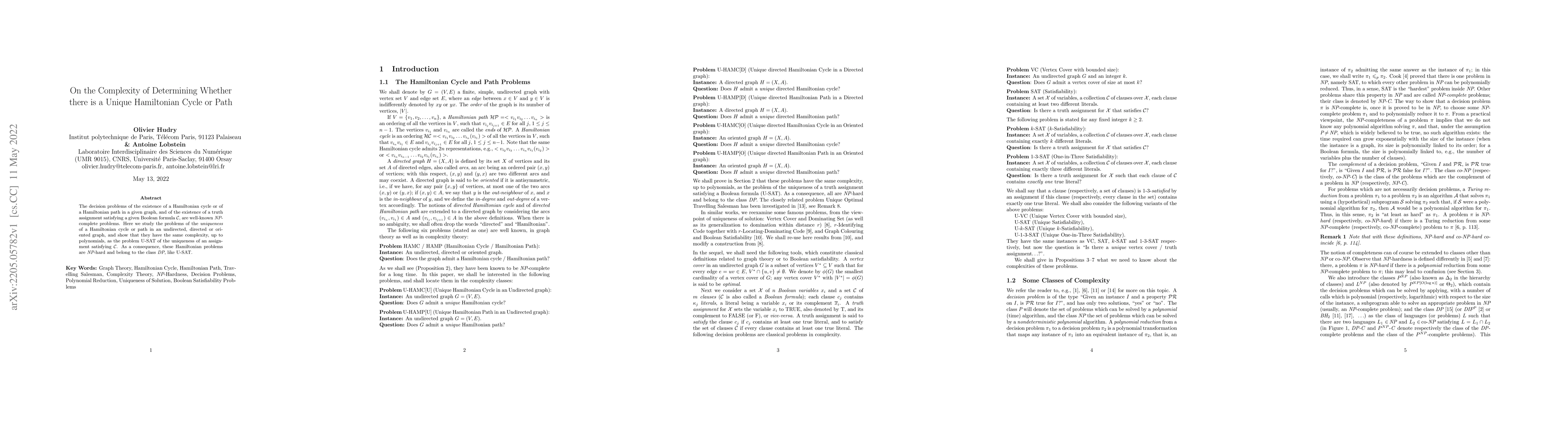 This paper examines the complexity of determining whether a Hamiltonian cycle or path in various types of graphs is unique, demonstrating that these problems share the same complexity as the U-SAT problem, classifying them as NP-hard and belonging to the DP class.