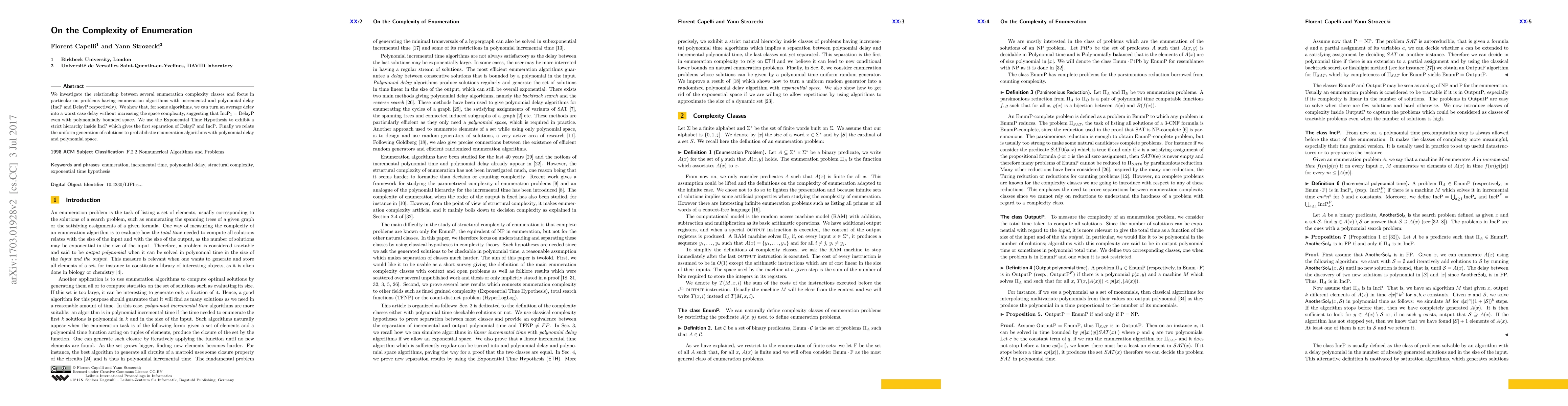 The paper explores enumeration complexity classes, demonstrating that incremental (IncP) and delay polynomial (DelayP) enumeration problems can sometimes be transformed without increasing space complexity, suggesting IncP_1 = DelayP under polynomial space. It also utilizes the Exponential Time Hypothesis to establish a strict hierarchy within IncP, separating DelayP from IncP, and connects uniform solution generation to probabilistic enumeration algorithms with polynomial delay and space.