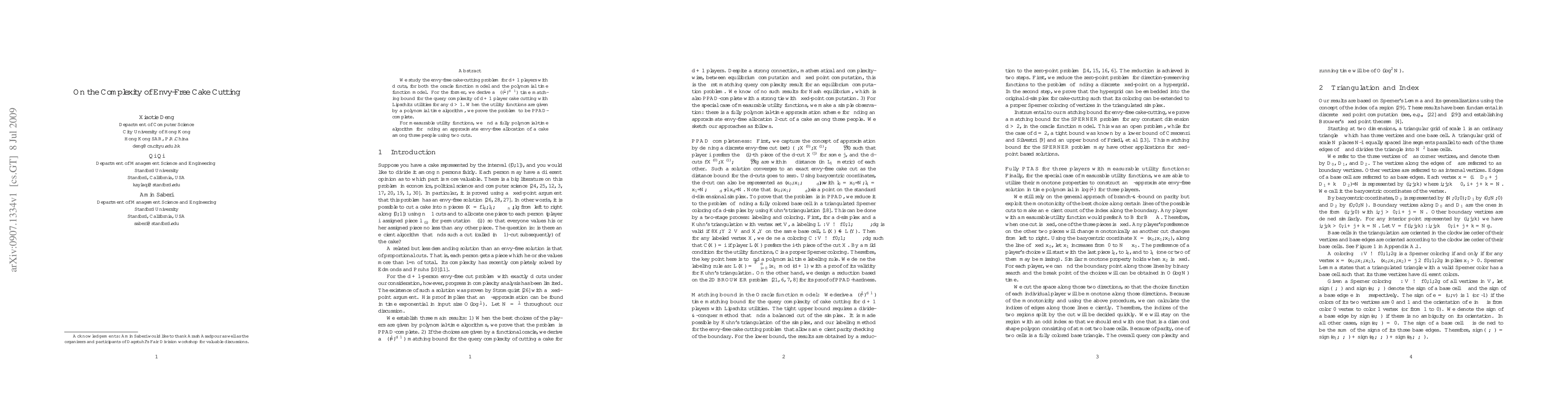 This paper investigates the complexity of envy-free cake cutting for multiple players, showing that the problem has a query complexity of $\theta(({1\over\epsilon})^{d-1})$ for $d+1$ players with $d$ cuts when utilities are Lipschitz. It also proves the problem is PPAD-complete when utility functions are computable by polynomial time functions, and provides a polynomial-time algorithm for an approximate envy-free division among three people using two cuts.