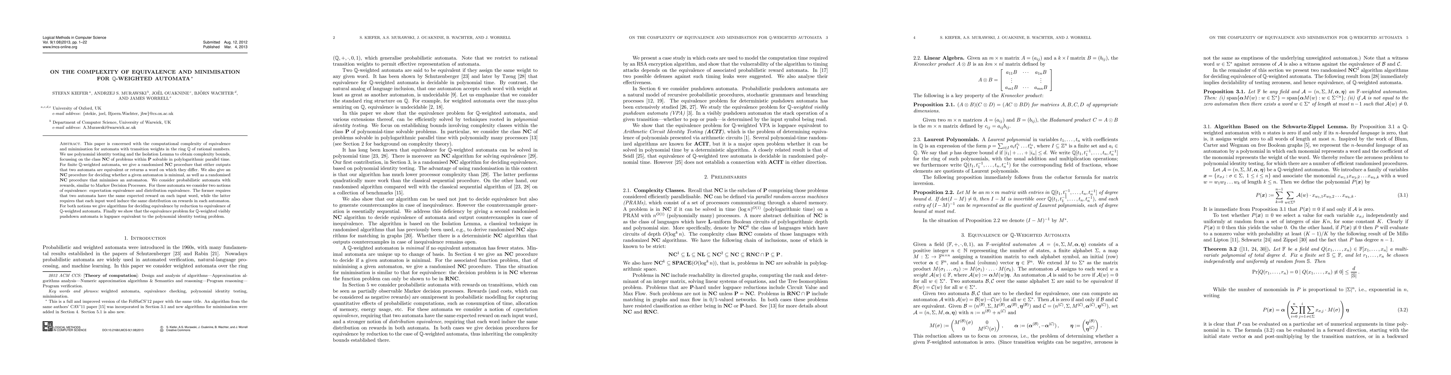 This paper investigates the computational complexity of equivalence and minimisation for Q-weighted automata, providing randomised NC procedures for determining equivalence and minimality. It also extends these concepts to probabilistic automata with rewards, establishing algorithms for expectation and distribution equivalence.