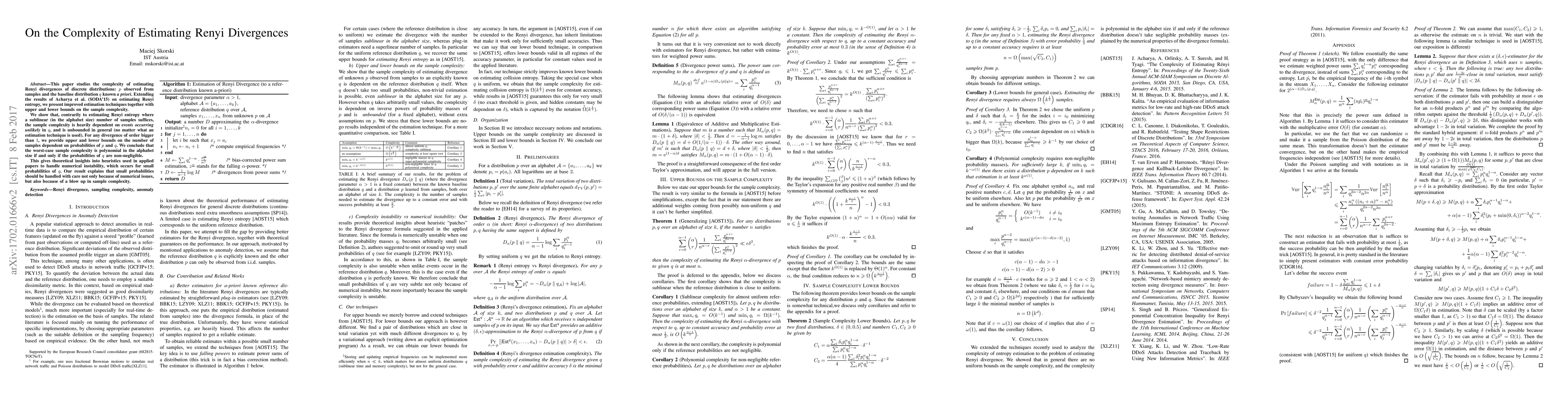 This paper investigates the complexity of estimating Renyi divergences between observed samples from distribution $p$ and a known baseline $q$, revealing that unlike Renyi entropy, Renyi divergence estimation requires a sample complexity heavily influenced by unlikely events in $q$, often leading to unbounded complexity. The study provides bounds on sample size dependent on probabilities of $p$ and $q$, highlighting the necessity to handle small probabilities in $q$ due to increased sample complexity.