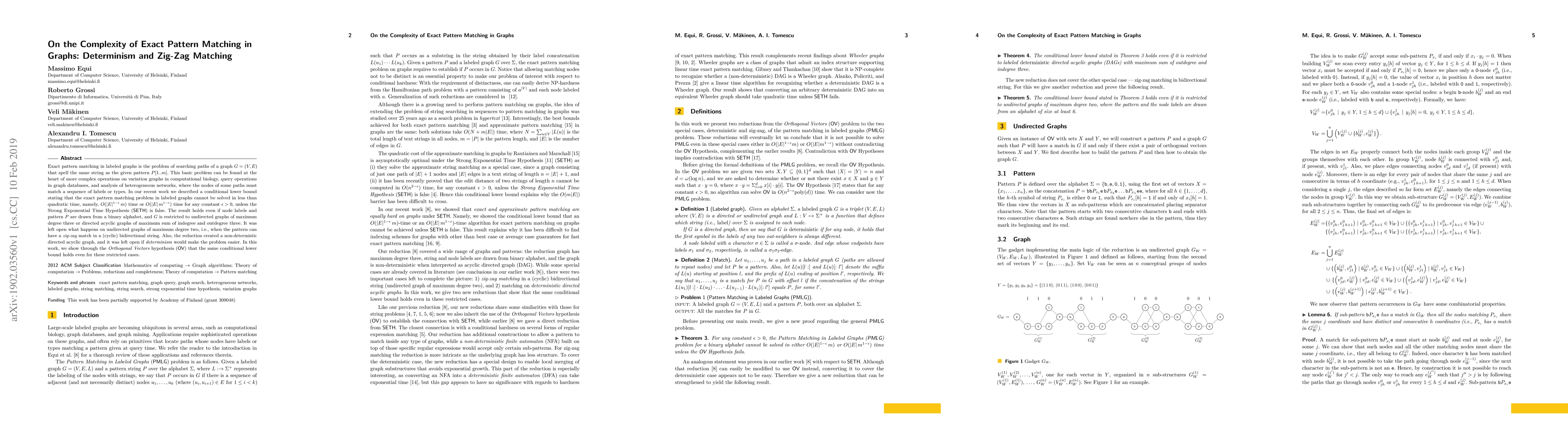 Exact pattern matching in labeled graphs is the problem of searching paths of a graph $G=(V,E)$ that spell the same string as the given pattern $P[1..m]$. This basic problem can be found at the heart of more complex operations on variation graphs in computational biology, query operations in graph databases, and analysis of heterogeneous networks, where the nodes of some paths must match a sequence of labels or types. In our recent work we described a conditional lower bound stating that the exact pattern matching problem in labeled graphs cannot be solved in less than quadratic time, namely, $O(|E|^{1 - \epsilon} \, m)$ time or $O(|E| \, m^{1 - \epsilon})$ time for any constant $\epsilon>0$, unless the Strong Exponential Time Hypothesis (SETH) is false. The result holds even if node labels and pattern $P$ are drawn from a binary alphabet, and $G$ is restricted to undirected graphs of maximum degree three or directed acyclic graphs of maximum sum of indegree and outdegree three. It was left open what happens on undirected graphs of maximum degree two, i.e., when the pattern can have a zig-zag match in a (cyclic) bidirectional string. Also, the reduction created a non-determistic directed acyclic graph, and it was left open if determinism would make the problem easier. In this work, we show through the Orthogonal Vectors hypothesis (OV) that the same conditional lower bound holds even for these restricted cases.