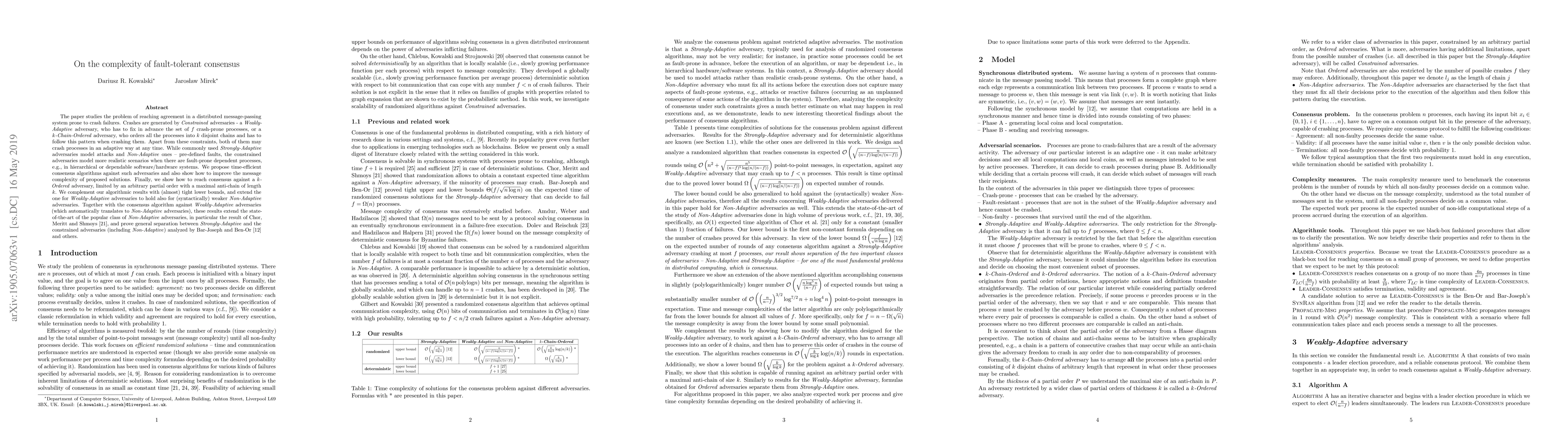 The paper studies the problem of reaching agreement in a distributed message-passing system prone to crash failures. Crashes are generated by \constrained\ adversaries - a \wadapt\ adversary, who has to fix in advance the set of $f$ crash-prone processes, or a \chainadapt\ adversary, who orders all the processes into $k$ disjoint chains and has to follow this pattern when crashing them. Apart from these constraints, both of them may crash processes in an adaptive way at any time. While commonly used \sadapt\ adversaries model attacks and \noadapt\ ones -- pre-defined faults, the constrained adversaries model more realistic scenarios when there are fault-prone dependent processes, e.g., in hierarchical or dependable software/hardware systems. We propose time-efficient consensus algorithms against such adversaries and also show how to improve the message complexity of proposed solutions. Finally, we show how to reach consensus against a \kthick\ adversary, limited by an arbitrary partial order \dk{with a maximal anti-chain of length $k$}. We complement our algorithmic results with (almost) tight lower bounds, and extend the one for \wadapt\ adversaries to hold also for (syntactically) weaker \noadapt\ adversaries. Together with the consensus algorithm against \wadapt\ adversaries (which automatically translates to \noadapt\ adversaries), these results extend the state-of-the-art of the popular class of \noadapt\ adversaries, in particular the result of Chor, Meritt and Shmoys~\cite{CMS}, and prove general separation between \sadapt\ and the constrained adversaries (including \noadapt) analyzed by Bar-Joseph and Ben-Or~\cite{BB} and others.
