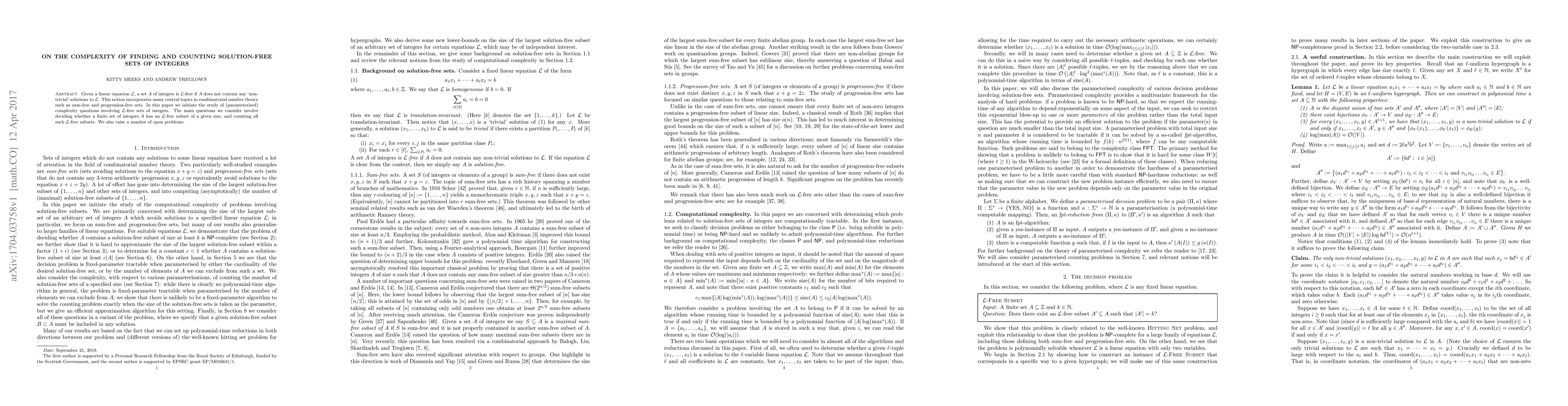 Given a linear equation $\mathcal{L}$, a set $A$ of integers is $\mathcal{L}$-free if $A$ does not contain any `non-trivial' solutions to $\mathcal{L}$. This notion incorporates many central topics in combinatorial number theory such as sum-free and progression-free sets. In this paper we initiate the study of (parameterised) complexity questions involving $\mathcal{L}$-free sets of integers. The main questions we consider involve deciding whether a finite set of integers $A$ has an $\mathcal{L}$-free subset of a given size, and counting all such $\mathcal{L}$-free subsets. We also raise a number of open problems.