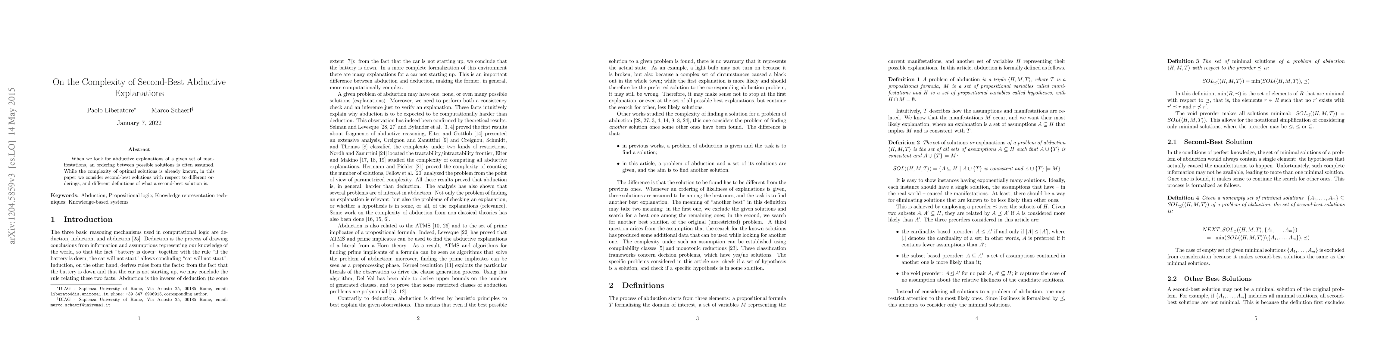 While looking for abductive explanations of a given set of manifestations, an ordering between possible solutions is often assumed. The complexity of finding/verifying optimal solutions is already known. In this paper we consider the computational complexity of finding second-best solutions. We consider different orderings, and consider also different possible definitions of what a second-best solution is.