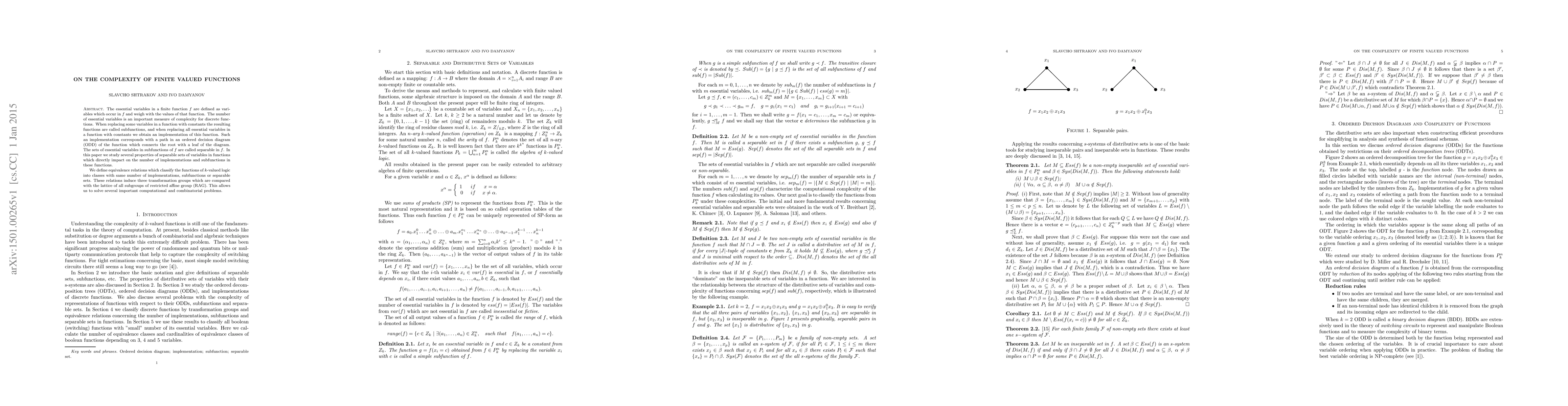This paper studies the complexity of finite valued functions by analyzing separable sets of variables, which impact the number of implementations and subfunctions, using equivalence relations and transformation groups to solve computational and combinatorial problems.