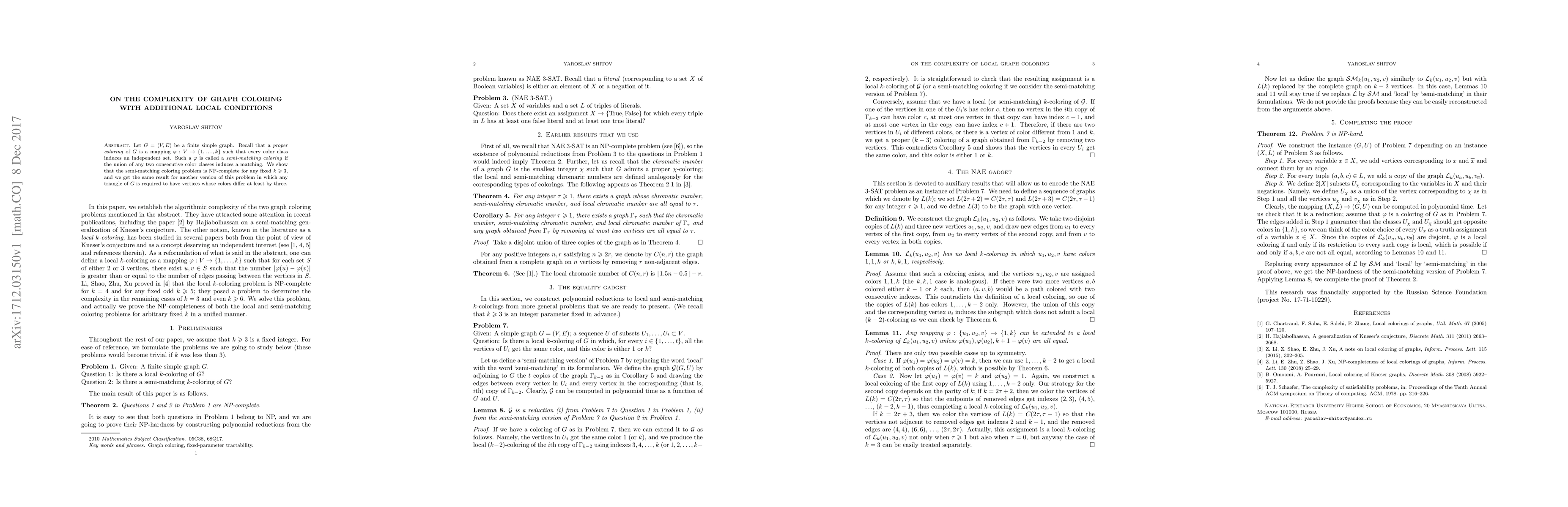 Let $G = (V,E)$ be a finite simple graph. Recall that a proper coloring of $G$ is a mapping $\varphi: V\to\{1,\ldots,k\}$ such that every color class induces an independent set. Such a $\varphi$ is called a semi-matching coloring if the union of any two consecutive color classes induces a matching. We show that the semi-matching coloring problem is NP-complete for any fixed $k\geqslant 3$, and we get the same result for another version of this problem in which any triangle of G is required to have vertices whose colors differ at least by three.