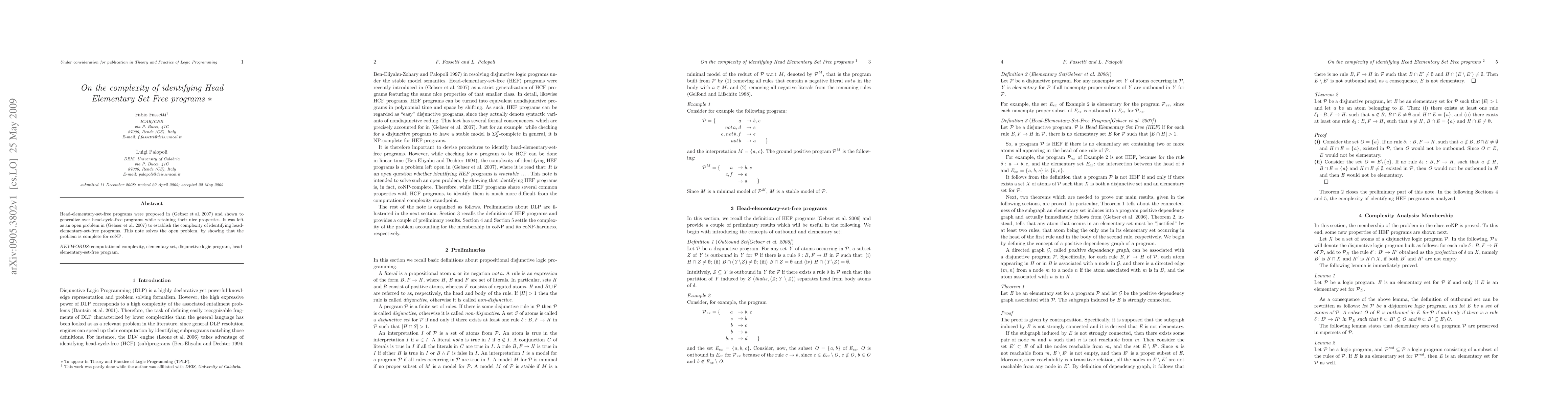 A research paper solves an open problem in computer science by showing that identifying head-elementary-set-free programs is complete for co-NP, a complexity class indicating hard problems to verify.