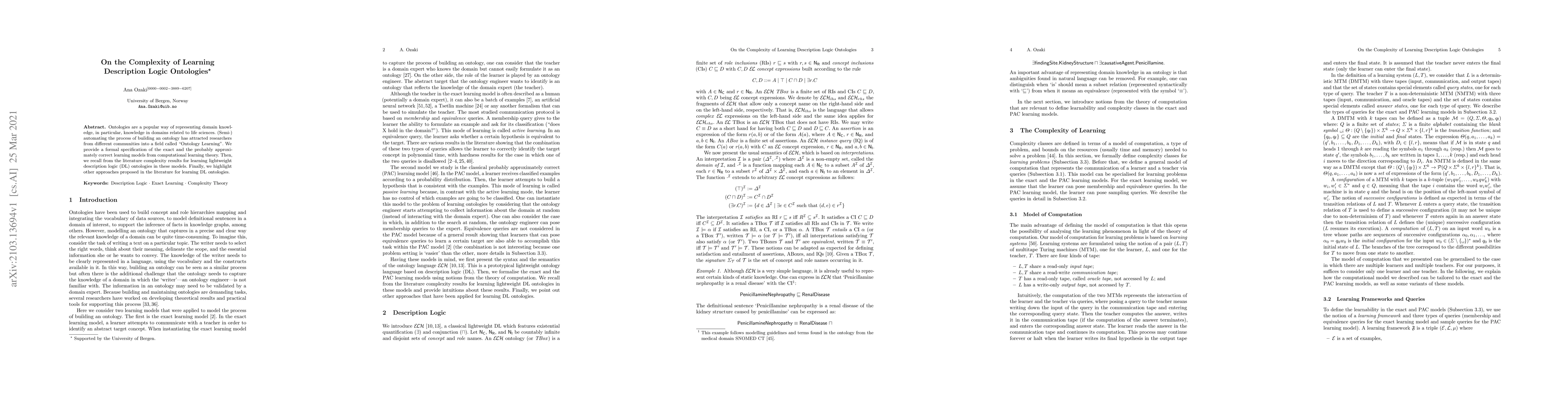 Ontologies are a popular way of representing domain knowledge, in particular, knowledge in domains related to life sciences. (Semi-)automating the process of building an ontology has attracted researchers from different communities into a field called "Ontology Learning". We provide a formal specification of the exact and the probably approximately correct learning models from computational learning theory. Then, we recall from the literature complexity results for learning lightweight description logic (DL) ontologies in these models. Finally, we highlight other approaches proposed in the literature for learning DL ontologies.