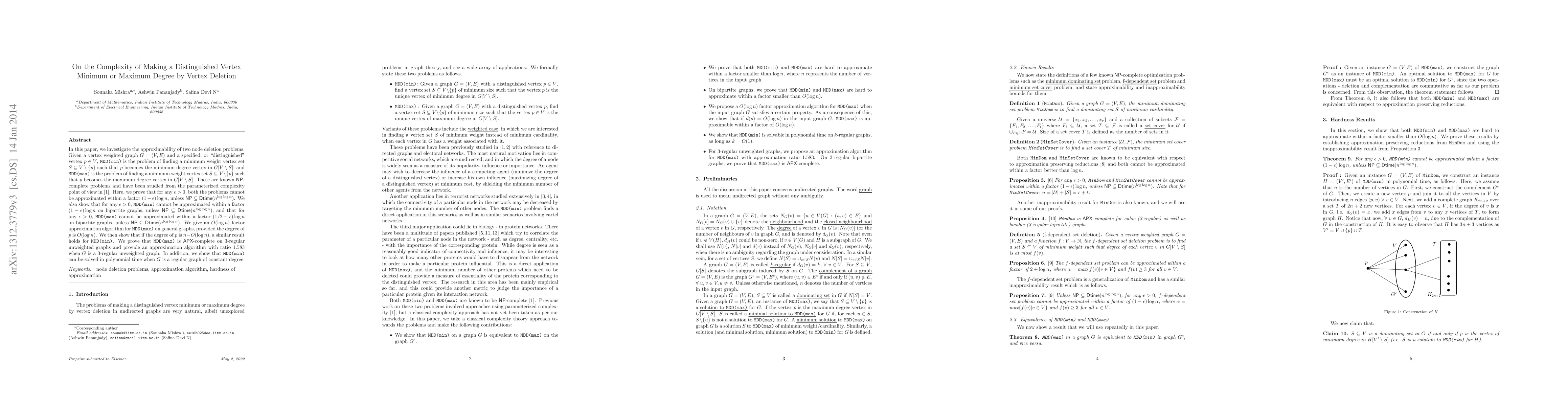 In this paper, we investigate the approximability of two node deletion problems. Given a vertex weighted graph $G=(V,E)$ and a specified, or "distinguished" vertex $p \in V$, MDD(min) is the problem of finding a minimum weight vertex set $S \subseteq V\setminus \{p\}$ such that $p$ becomes the minimum degree vertex in $G[V \setminus S]$; and MDD(max) is the problem of finding a minimum weight vertex set $S \subseteq V\setminus \{p\}$ such that $p$ becomes the maximum degree vertex in $G[V \setminus S]$. These are known $NP$-complete problems and have been studied from the parameterized complexity point of view in previous work. Here, we prove that for any $\epsilon > 0$, both the problems cannot be approximated within a factor $(1 - \epsilon)\log n$, unless $NP \subseteq DTIME(n^{\log\log n})$. We also show that for any $\epsilon > 0$, MDD(min) cannot be approximated within a factor $(1 -\epsilon)\log n$ on bipartite graphs, unless $NP \subseteq DTIME(n^{\log\log n})$, and that for any $\epsilon > 0$, MDD(max) cannot be approximated within a factor $(1/2 - \epsilon)\log n$ on bipartite graphs, unless $NP \subseteq DTIME(n^{\log\log n})$. We give an $O(\log n)$ factor approximation algorithm for MDD(max) on general graphs, provided the degree of $p$ is $O(\log n)$. We then show that if the degree of $p$ is $n-O(\log n)$, a similar result holds for MDD(min). We prove that MDD(max) is $APX$-complete on 3-regular unweighted graphs and provide an approximation algorithm with ratio $1.583$ when $G$ is a 3-regular unweighted graph. In addition, we show that MDD(min) can be solved in polynomial time when $G$ is a regular graph of constant degree.