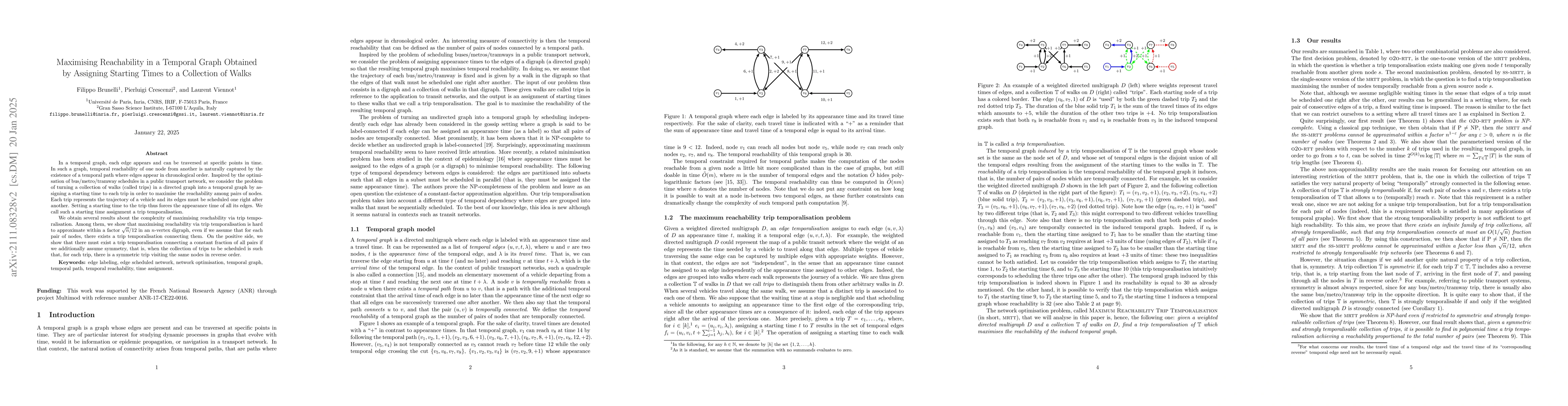 We consider the problem of assigning appearing times to the edges of a digraph in order to maximize the (average) temporal reachability between pairs of nodes. Motivated by the application to public transit networks, where edges cannot be scheduled independently one of another, we consider the setting where the edges are grouped into certain walks (called trips) in the digraph and where assigning the appearing time to the first edge of a trip forces the appearing times of the subsequent edges. In this setting, we show that, quite surprisingly, it is NP-complete to decide whether there exists an assignment of times connecting a given pair of nodes. This result allows us to prove that the problem of maximising the temporal reachability cannot be approximated within a factor better than some polynomial term in the size of the graph. We thus focus on the case where, for each pair of nodes, there exists an assignment of times such that one node is reachable from the other. We call this property strong temporalisability. It is a very natural assumption for the application to public transit networks. On the negative side, the problem of maximising the temporal reachability remains hard to approximate within a factor $\sqrt$ n/12 in that setting. Moreover, we show the existence of collections of trips that are strongly temporalisable but for which any assignment of starting times to the trips connects at most an O(1/ $\sqrt$ n) fraction of all pairs of nodes. On the positive side, we show that there must exist an assignment of times that connects a constant fraction of all pairs in the strongly temporalisable and symmetric case, that is, when the set of trips to be scheduled is such that, for each trip, there is a symmetric trip visiting the same nodes in reverse order. Keywords:edge labeling edge scheduled network network optimisation temporal graph temporal path temporal reachability time assignment