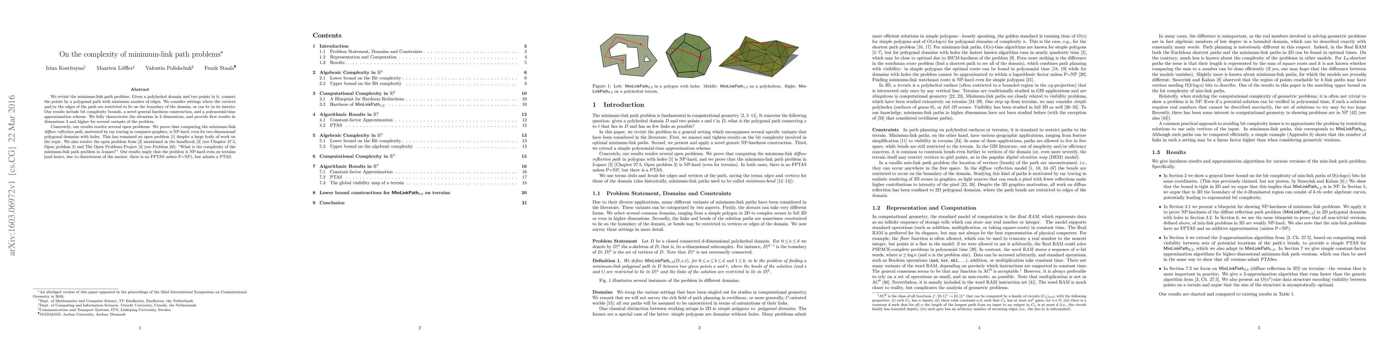 The paper resolves several open problems in the minimum-link path problem, proving its NP-hardness in 2D and 3D spaces, but offering a polynomial-time approximation scheme for certain variants.