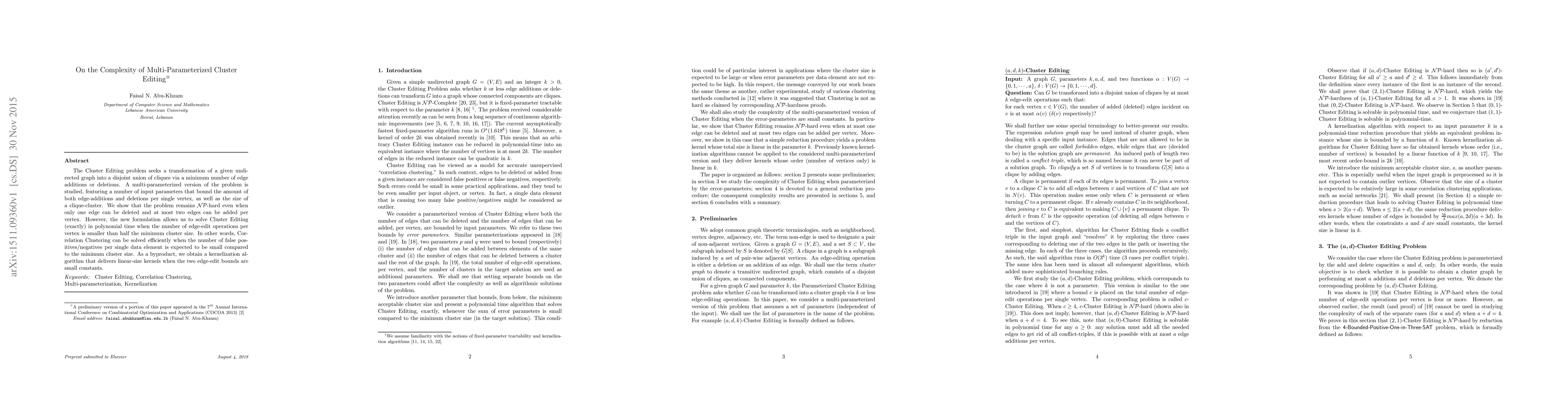 The paper explores the complexity of a multi-parameterized Cluster Editing problem, demonstrating its NP-hardness under certain constraints while showing polynomial-time solvability under others. It also provides a kernelization algorithm yielding linear-size kernels for small edge-edit bounds.