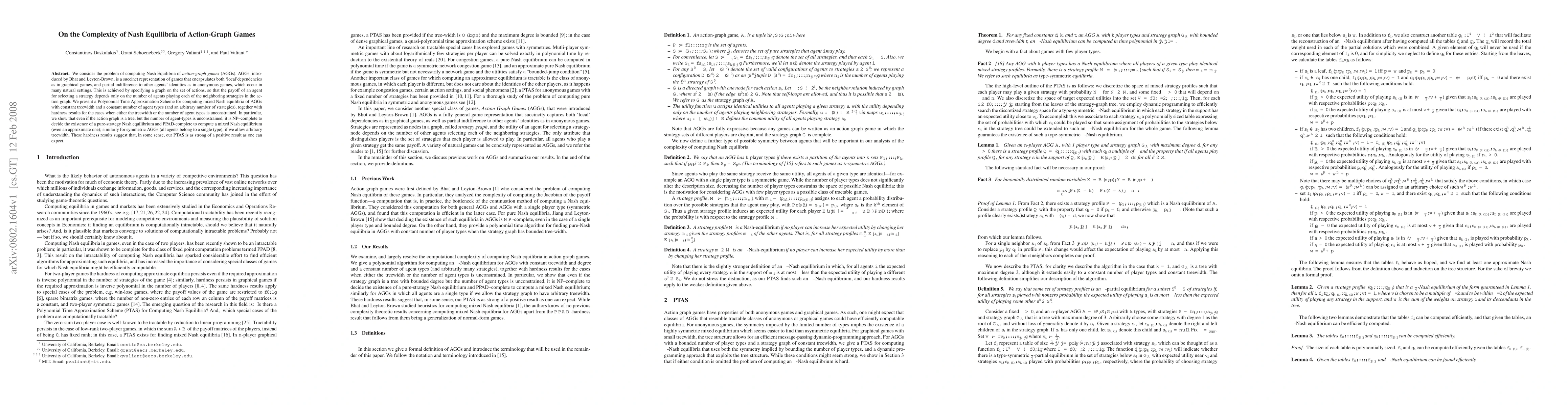 This paper presents a Polynomial Time Approximation Scheme for computing mixed Nash equilibria in action-graph games with constrained treewidth and a fixed number of agent types. It also establishes NP-completeness and PPAD-completeness for scenarios with unconstrained treewidth or agent types, highlighting the limitations of exact computation in more complex settings.