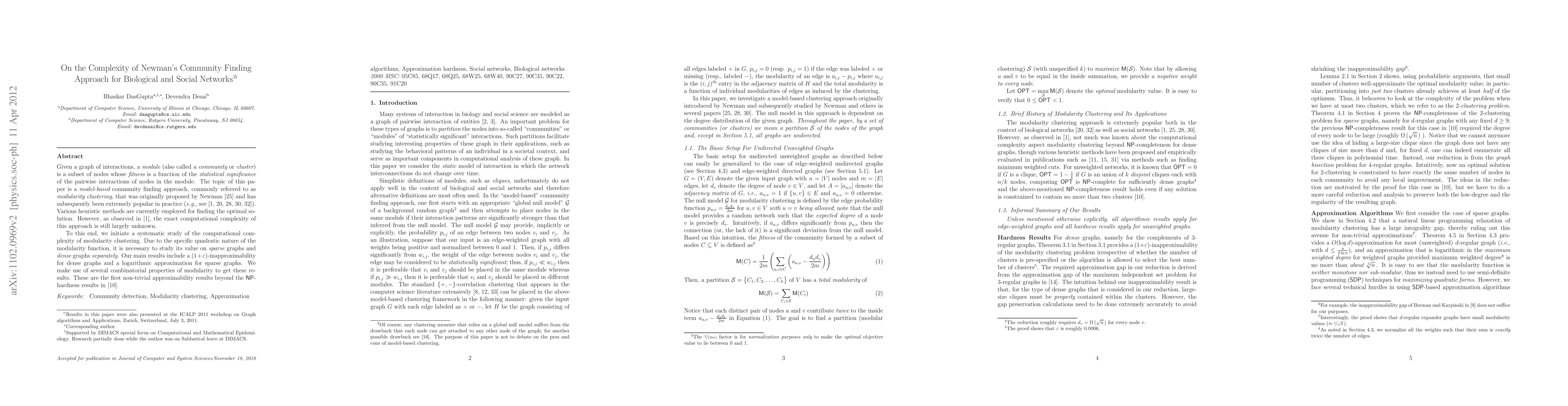 Given a graph of interactions, a module (also called a community or cluster) is a subset of nodes whose fitness is a function of the statistical significance of the pairwise interactions of nodes in the module. The topic of this paper is a model-based community finding approach, commonly referred to as modularity clustering, that was originally proposed by Newman and has subsequently been extremely popular in practice. Various heuristic methods are currently employed for finding the optimal solution. However, the exact computational complexity of this approach is still largely unknown. To this end, we initiate a systematic study of the computational complexity of modularity clustering. Due to the specific quadratic nature of the modularity function, it is necessary to study its value on sparse graphs and dense graphs separately. Our main results include a (1+\eps)-inapproximability for dense graphs and a logarithmic approximation for sparse graphs. We make use of several combinatorial properties of modularity to get these results. These are the first non-trivial approximability results beyond the previously known NP-hardness results.