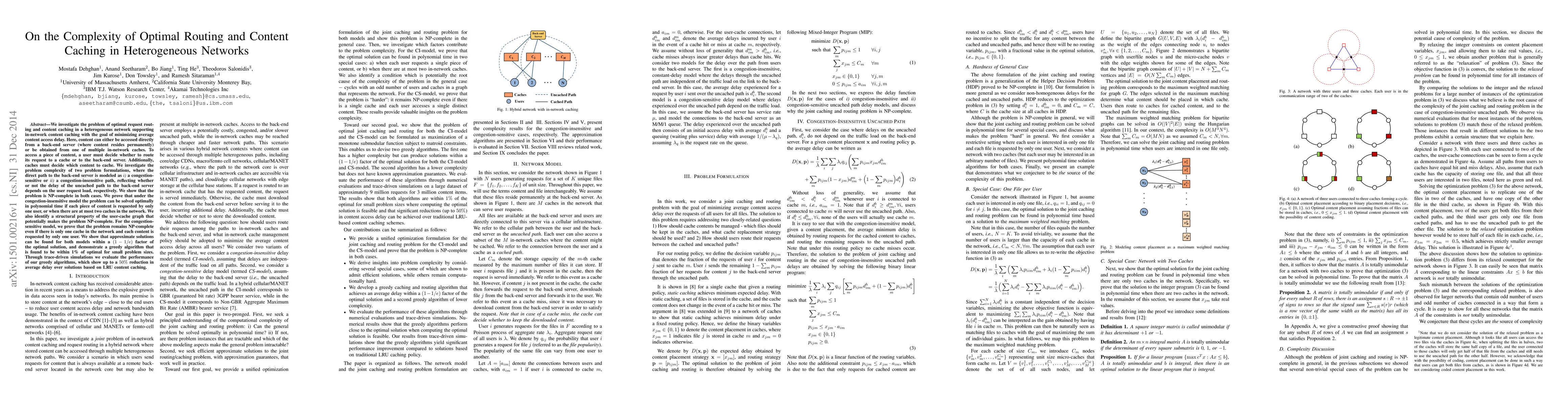 We investigate the problem of optimal request routing and content caching in a heterogeneous network supporting in-network content caching with the goal of minimizing average content access delay. Here, content can either be accessed directly from a back-end server (where content resides permanently) or be obtained from one of multiple in-network caches. To access a piece of content, a user must decide whether to route its request to a cache or to the back-end server. Additionally, caches must decide which content to cache. We investigate the problem complexity of two problem formulations, where the direct path to the back-end server is modeled as i) a congestion-sensitive or ii) a congestion-insensitive path, reflecting whether or not the delay of the uncached path to the back-end server depends on the user request load, respectively. We show that the problem is NP-complete in both cases. We prove that under the congestion-insensitive model the problem can be solved optimally in polynomial time if each piece of content is requested by only one user, or when there are at most two caches in the network. We also identify a structural property of the user-cache graph that potentially makes the problem NP-complete. For the congestion-sensitive model, we prove that the problem remains NP-complete even if there is only one cache in the network and each content is requested by only one user. We show that approximate solutions can be found for both models within a (1-1/e) factor of the optimal solution, and demonstrate a greedy algorithm that is found to be within 1% of optimal for small problem sizes. Through trace-driven simulations we evaluate the performance of our greedy algorithms, which show up to a 50% reduction in average delay over solutions based on LRU content caching.